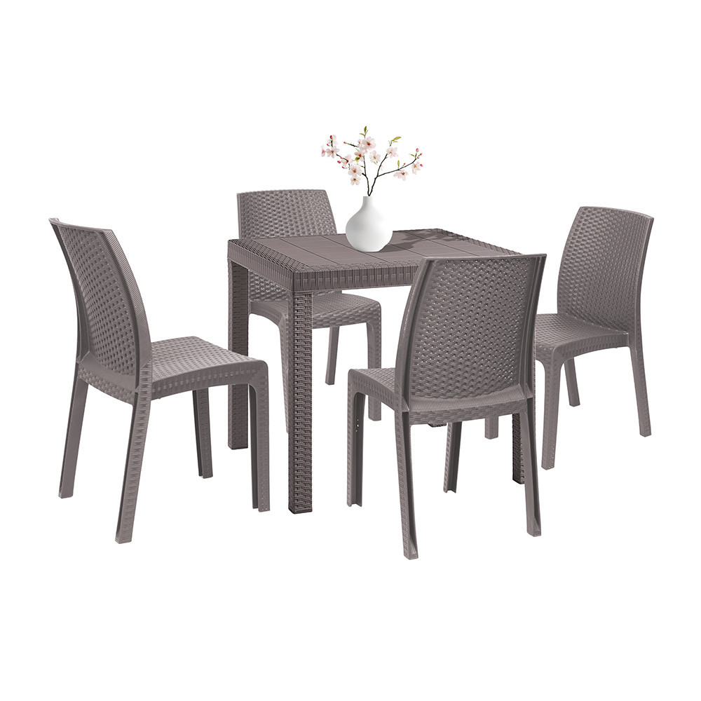 Setul Goti include patru scaune de grădină Vanda , care, cu suprafața lor cu efect de ratan în culoarea cappuccino, se integrează natural în atmosfera grădinii, terasei sau localului dumneavoastră de catering.