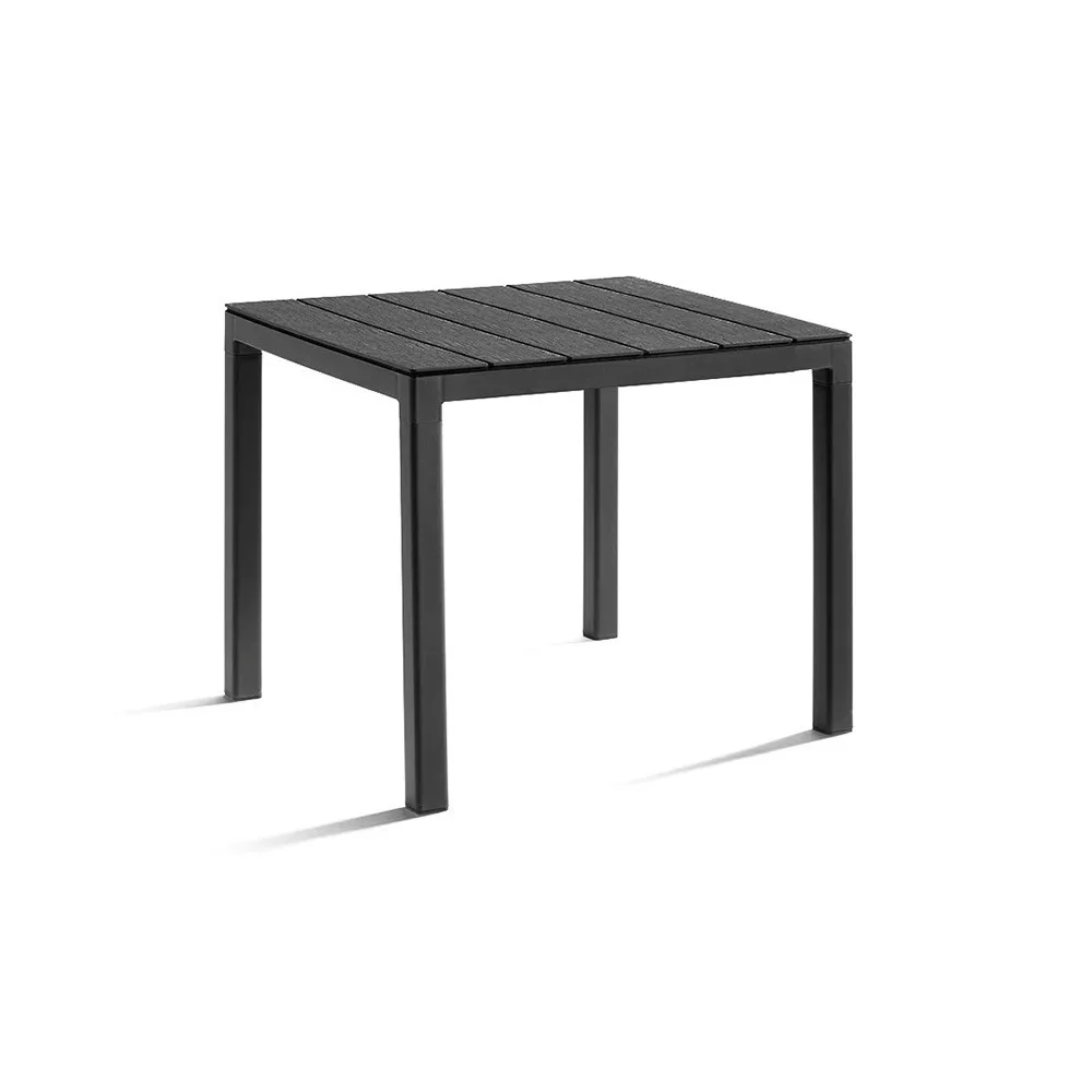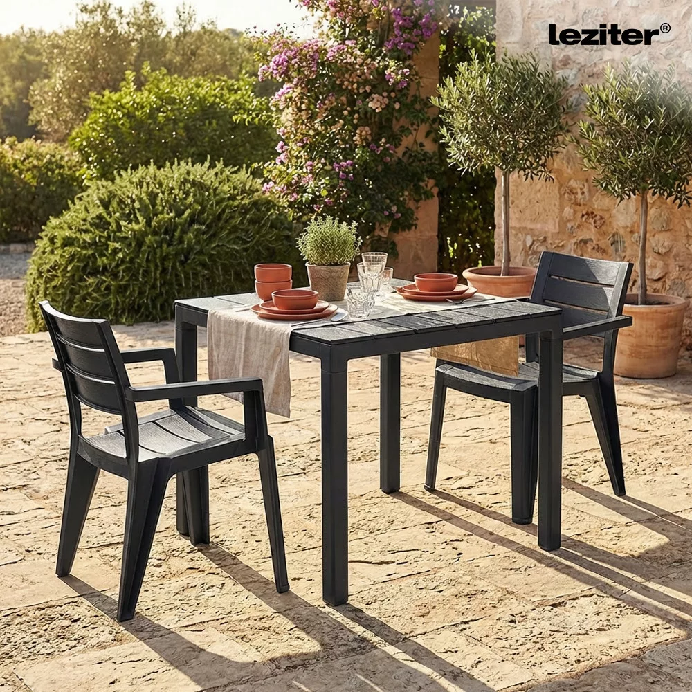 Alegeți masa de grădină din plastic Evan în grafit pentru a crea o zonă practică și modernă de luat masa sau lounge în aer liber.