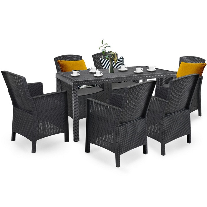 Acest set de mobilier de culoare grafit , confortabil și elegant, este fabricat în Italia. Include șase fotolii de 56x 60x 90 cm și o masă înaltă pătrată de 150x 90x 74 cm. Pe lângă dimensiunile și confortul său, poate fi avantajos faptul că asamblarea sa nu necesită cunoștințe profesionale și este ușor de mutat, astfel încât să o puteți pune oricând unde aveți nevoie.