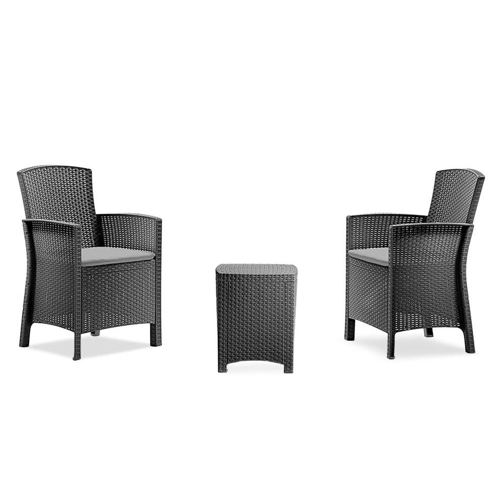 Setul de mobilier de grădină din ratan de culoare grafit este format din două fotolii de 60 x 56 x 90 cm și o masă dreptunghiulară de 39 x 39 x 46 cm. Acesta este un produs de înaltă calitate, fabricat din plastic turnat prin injecție de cea mai înaltă calitate.