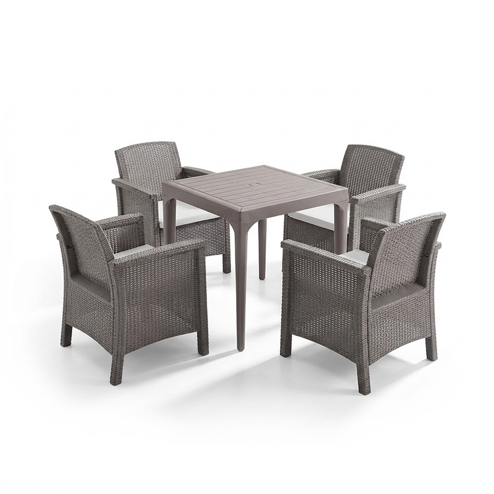 A garnitúrához 4 db Venus karfás műanyag szék tartozik, amelyek rattan hatású felületükkel és ergonomikus kialakításukkal nemcsak látványos, hanem igazán kényelmes megoldást nyújtanak a szabadtéri időtöltéshez. A kényelmet a tartozék szürke ülőpárna teszi teljessé – ideális egy hosszú ebédhez vagy egy baráti beszélgetéshez a kertben.