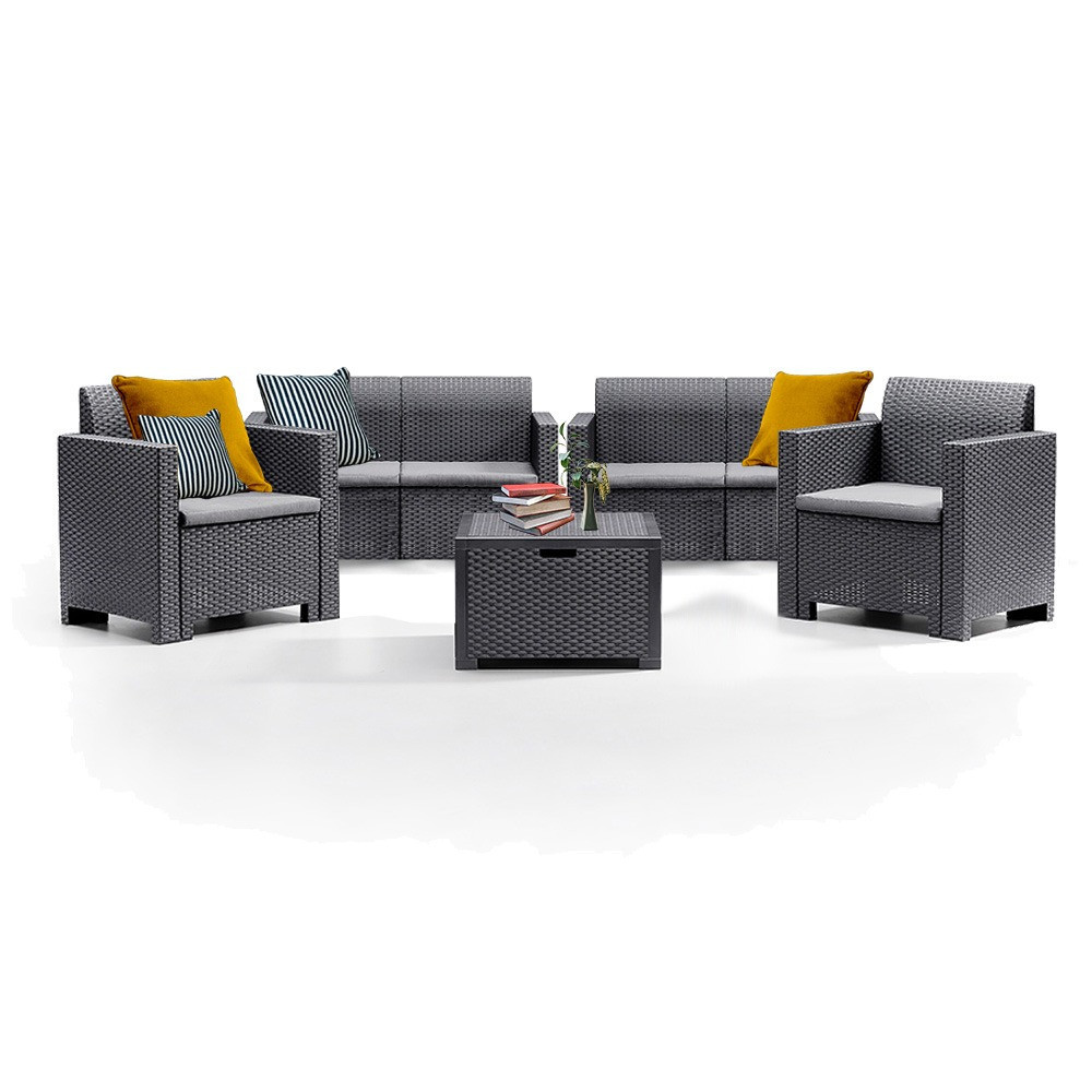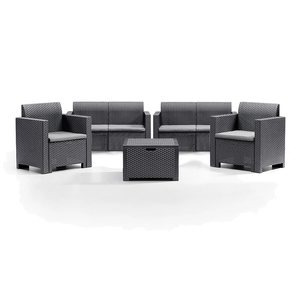 Acest set de mobilier italian , de culoare grafit , confortabil și elegant, include două fotolii de 57,5x 75x 79 cm, două canapele cu două locuri de 57,5x 79x 131 cm și o masă dreptunghiulară de 40x 64x 64 cm. Acest set de mobilier de grădină pentru 6 persoane oferă suficient spațiu pentru familie și oferă senzația că stau în sufragerie, dar pot petrece totuși timp în aer liber. Este, de asemenea , o alegere excelentă dacă îți place să te relaxezi și să citești în curte în timpul zilei, întins pe o canapea. Este potrivit pentru reuniuni de familie și evenimente de afaceri, deoarece face ca orice spațiu să fie modern și confortabil prin aspectul său.