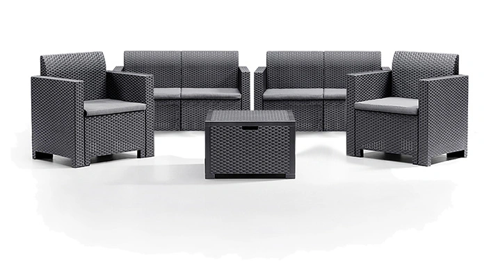 Acest set este fabricat din plastic rezistent la razele UV dăunătoare și la condițiile meteorologice. O alegere durabilă, atemporală, care poate fi folosită tot timpul anului. Setul de mobilier se potrivește ideal în orice spațiu din jurul casei, unde creează un loc potrivit pentru relaxare și divertisment în aer liber, dar poate fi folosit și pentru a crea o atmosferă de lounge perfectă pe terasa unui restaurant. Suprafața sa inspirată de țesătura naturală a ratanului este unul dintre avantajele estetice ale produsului.