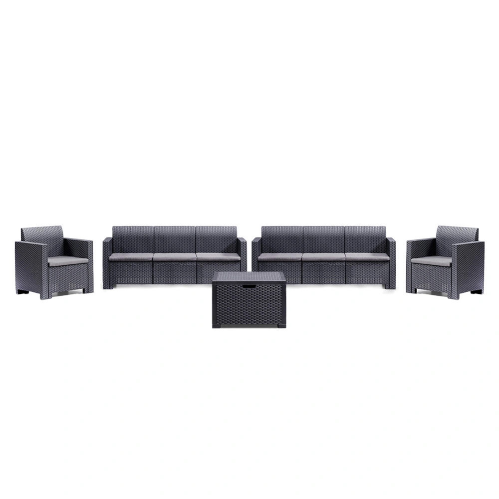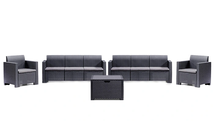 Acest set de mobilier de culoare grafit , confortabil și elegant, include două fotolii de 57,5x 75x 79 cm, două canapele cu trei locuri de 57,5x 79x 188 cm și o masă dreptunghiulară de 40x 64x 64 cm. Acest set de mobilier de grădină pentru 8 persoane oferă suficient spațiu pentru ca întreaga familie sau grupul de prieteni să petreacă timp în aer liber. Acest set va adăuga culoare oricărei curți sau terase cu aspectul său modern .