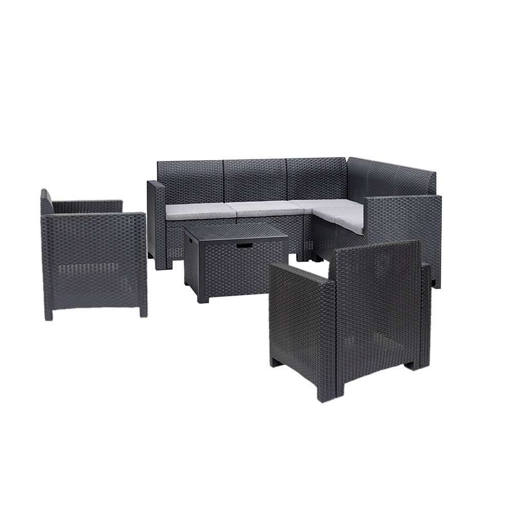 Perfect pentru întâlnirile din grădină: Setul de mobilier de grădină de colț Nero V 7 poate fi un plus elegant și practic pentru orice terasă și grădină. Acest set de mobilier modern, de culoare grafit, oferă o canapea de colț confortabilă cu cinci locuri, două canapele de grădină și o masă pătrată multifuncțională care poate servi și ca spațiu de depozitare. Acest set este alegerea perfectă pentru reuniunile mai mari de familie sau cu prietenii. Datorită dimensiunii setului, acesta oferă mult spațiu pentru întreaga familie.