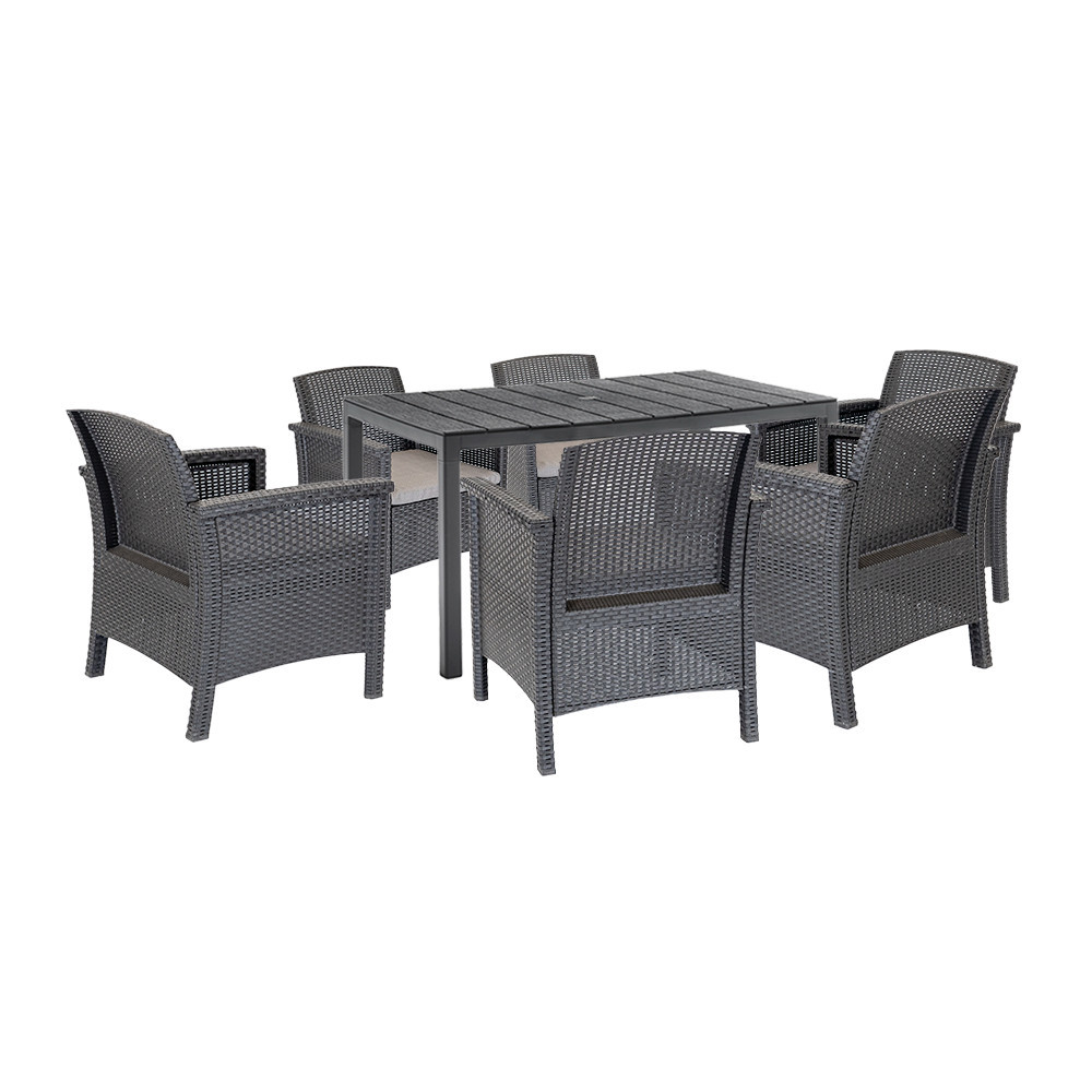 Setul include 6fotolii din plastic Venus cu suprafață cu efect de rattan și design ergonomic, care nu numai că arată bine, dar oferă și o soluție cu adevărat confortabilă pentru divertismentul în aer liber. Confortul este completat de perna de scaun gri inclusă - ideală pentru un prânz lung sau o discuție cu prietenii în grădină.