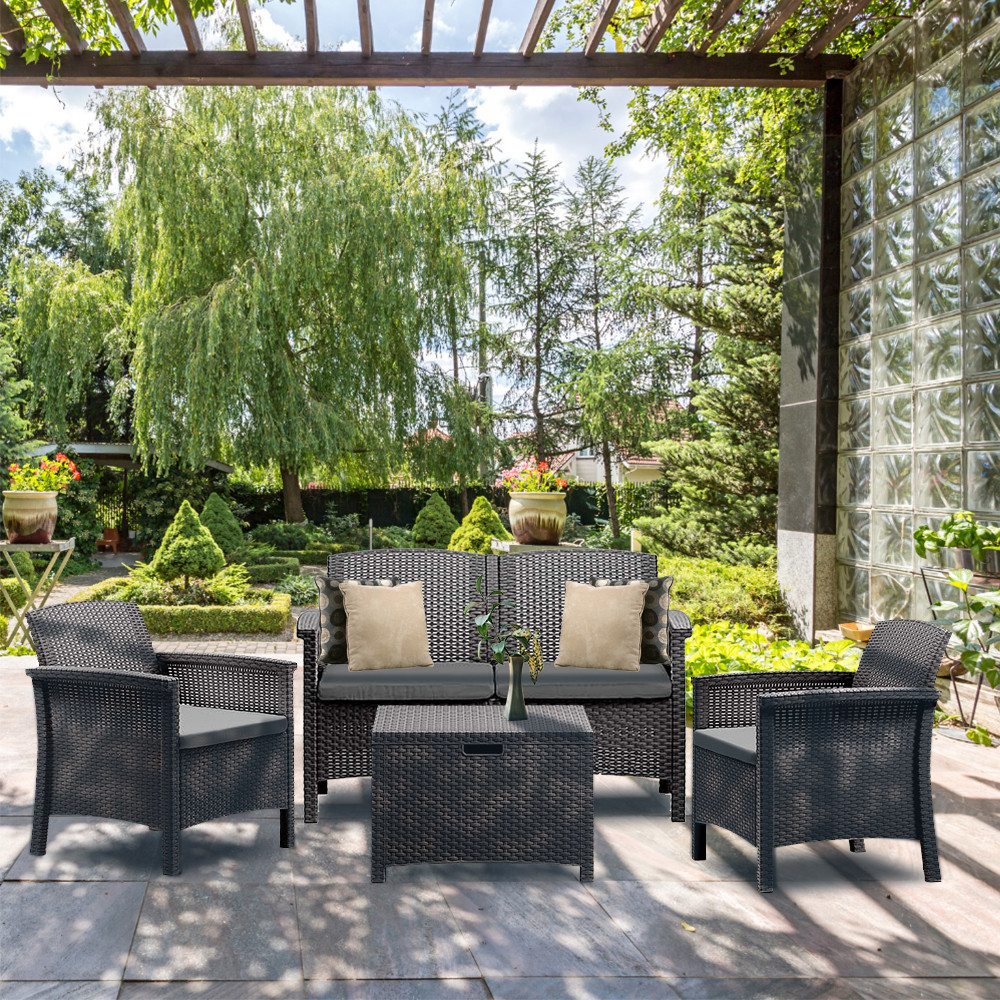 Acest set de mobilier de grădină din ratan artificial cu 4 locuri are multe avantaje. Elementele sale sunt confortabile, practice și ușor de utilizat. Materialele sunt durabile și rezistente la intemperii, asigurând o durată lungă de viață și nu trebuie să vă faceți griji cu privire la întreținere. Măsuța laterală mică se potrivește confortabil în mijloc și vă permite să așezați băuturi și mâncare, făcând relaxarea în aer liber și mai confortabilă.