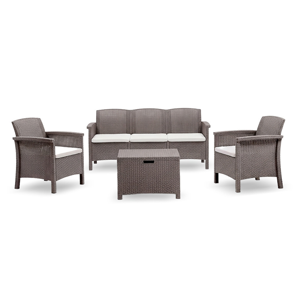 A Venus II 5 személyes kerti bútor garnitúra ideális választás kisebb családok vagy baráti társaságok számára. A két fotel, a három személyes kanapé és az asztal harmonikus elrendezést biztosít, amely kényelmes pihenést tesz lehetővé kertben, teraszon vagy erkélyen. A cappuccino szín modern megjelenést kölcsönöz, a rattan hatású felület pedig elegáns összhatást teremt.