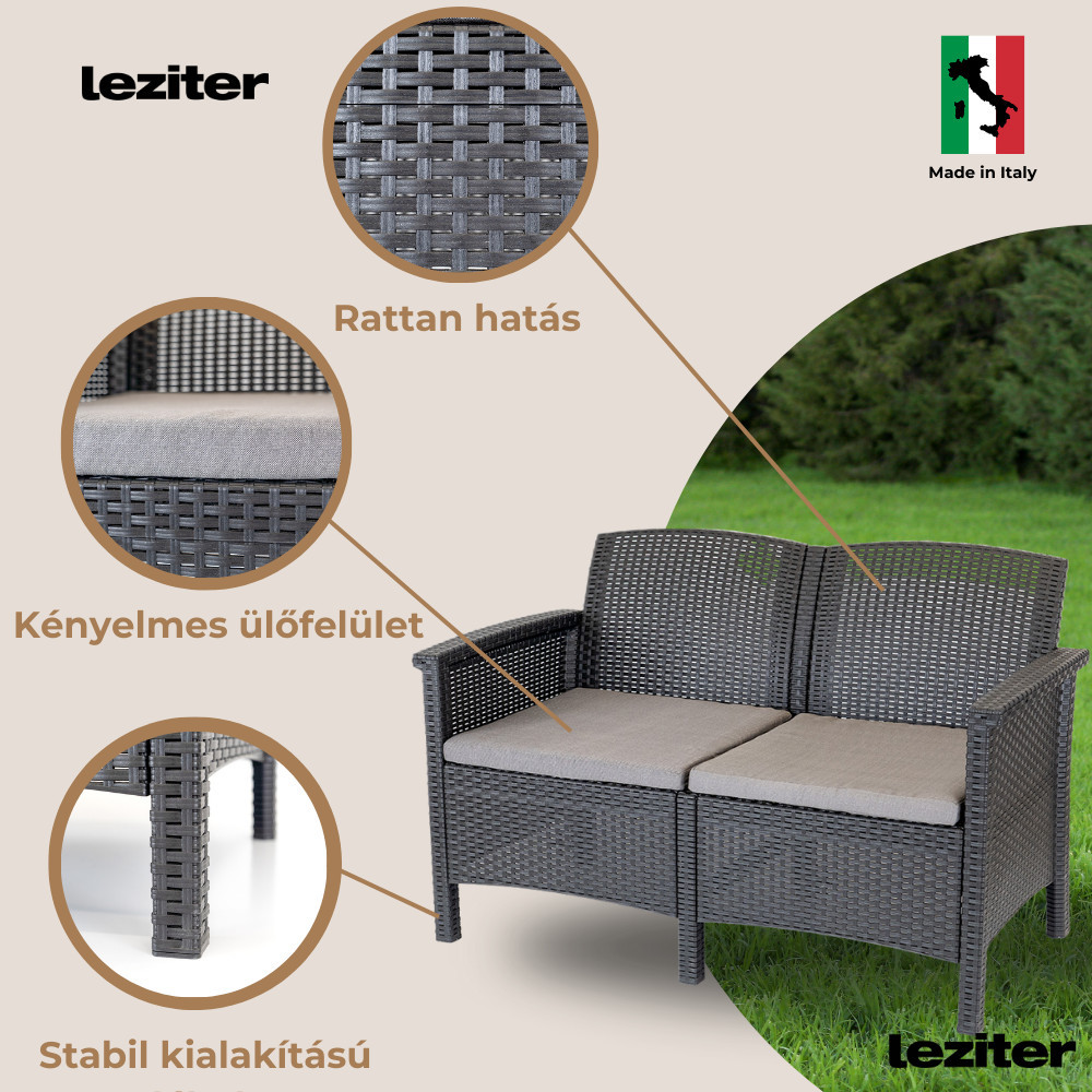 Canapeaua de grădină Venus cu 2 locuri este realizată într-o culoare grafit discretă . Pernele scaunului sunt cu câteva nuanțe mai deschise, ceea ce le conferă un efect și o eleganță unice.