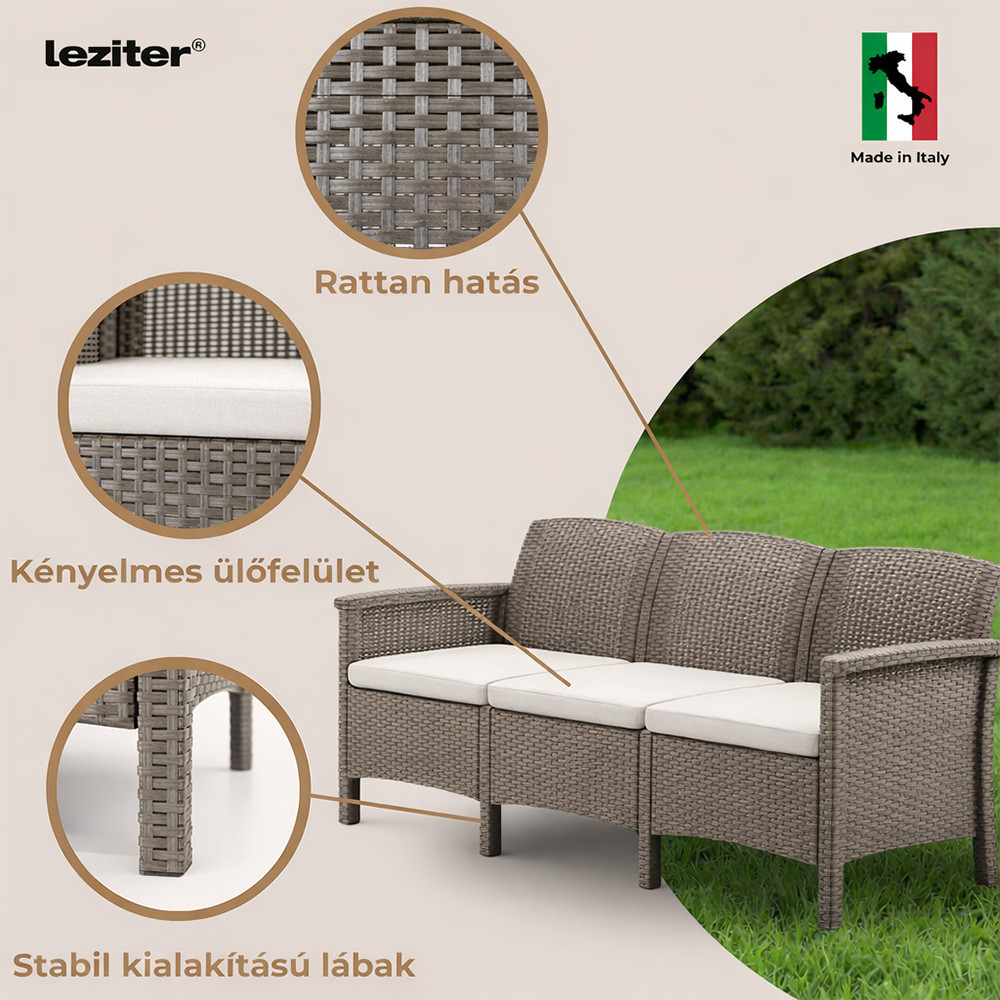 Az UV-álló műanyag rattan szerkezet ellenáll az időjárás viszontagságainak, így a bútor hosszú távon is megőrzi minőségét. A karbantartásmentes kialakítás egész éves használatot tesz lehetővé. A felület vízzel vagy enyhe tisztítószerrel egyszerűen tisztítható, az ülőpárnák pedig moshatók, így a mindennapi használat során is praktikus választás.