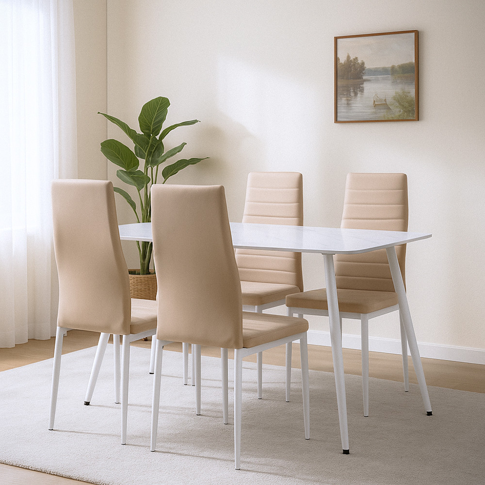 Combinația contrastantăde culori bej-gri încadrează elegant starea de spirit a spațiului, în timp ce suprafețele ușor de curățat și rezistente la uzură fac din aceasta o alegere cu adevărat practică pentru zilele lucrătoare aglomerate și ocaziile speciale deopotrivă. Setul este o alegere impecabilă pentru familiile mici sau cuplurile care apreciază materialele atemporale și designul modern.