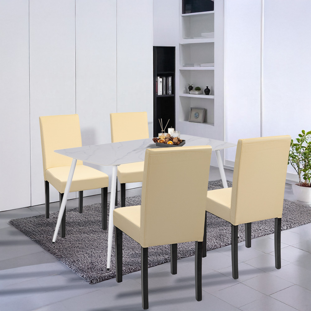 Setul include patru scaune Leziter Kelly, care, datorită tapițeriei din piele bej, sunt nu doar elegante, ci și extrem de ușor de curățat. Șezutul gros din spumă, de 4 cm, oferă confort chiar și în timpul unei cine mai lungi, iar picioarele stabile din lemn de pin, cu o capacitate de încărcare de 120 kg, rămân tovarăși de încredere chiar și în timpul utilizării intense.