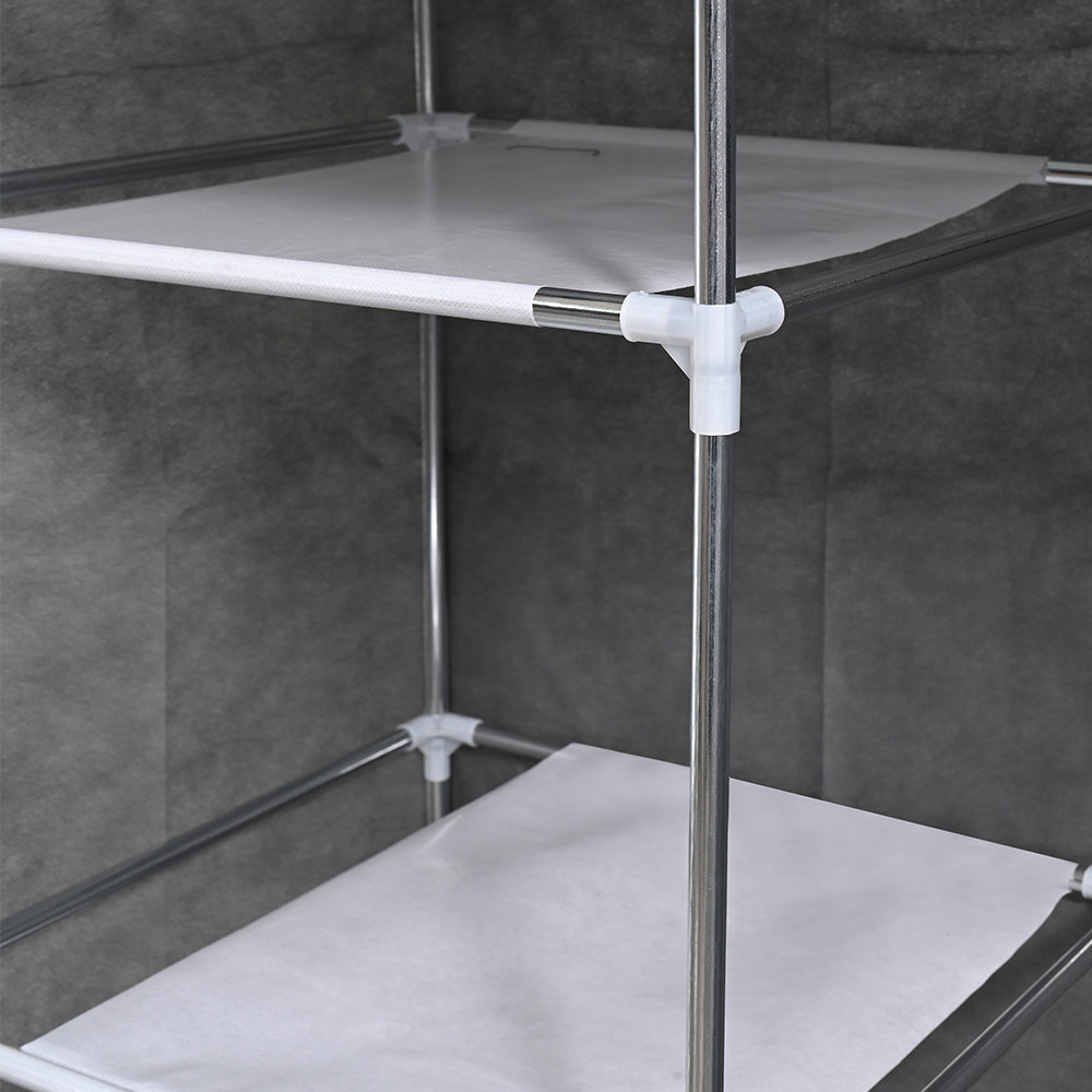 - Material: Cadru metalic durabil și husă din țesătură de poliester de înaltă calitate, care rezistă la utilizarea zilnică și protejează hainele de praf și murdărie. Structura metalică este ranforsată cu elemente de fixare din plastic, asigurând stabilitatea dulapului.