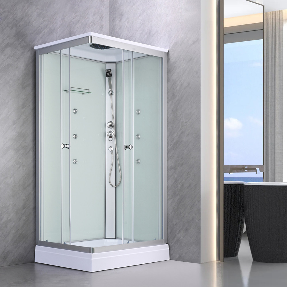 Cabina de duș Valerie este un produs extrem de elegant, care arată grozav în orice baie. Disponibil cu o cădiță de duș. Este disponibil în cinci dimensiuni: 80x80, 90x90, 70x100, 80x100, 80x120. Are un robinet mixer, o manetă selector de funcții, un raft pentru lavabou și un duș deasupra capului. Panou de duș cromat pe toată înălțimea cabinei.