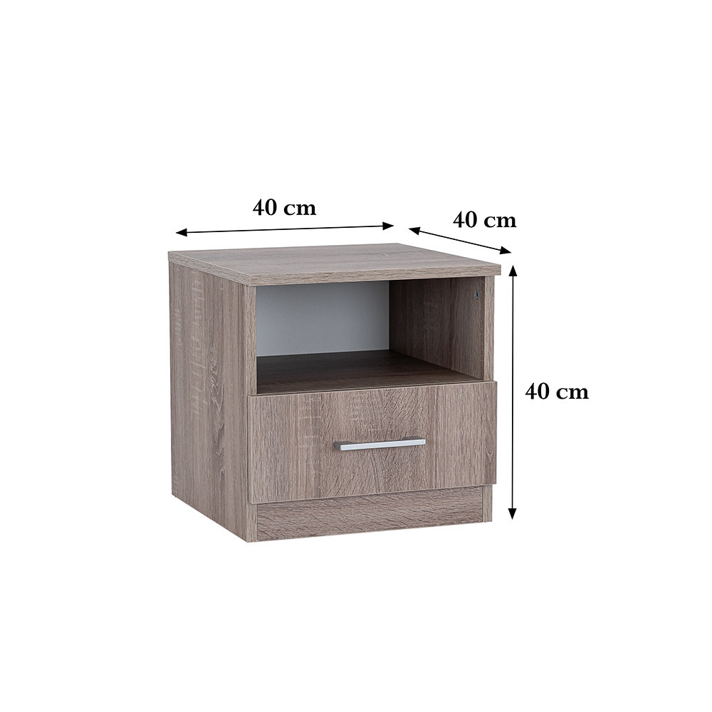 Măsurând 40x40x40 cm, noptiera se potrivește perfect în dormitoarele mici, fără a ocupa prea mult spațiu. Sertarul cu rotițe se deschide și se închide fără probleme, oferindu-vă acces ușor la cărți, ochelari sau telefon. Dulapul de noptieră a fost proiectat cu un raft suplimentar pentru a ține obiectele importante, utilizate frecvent.