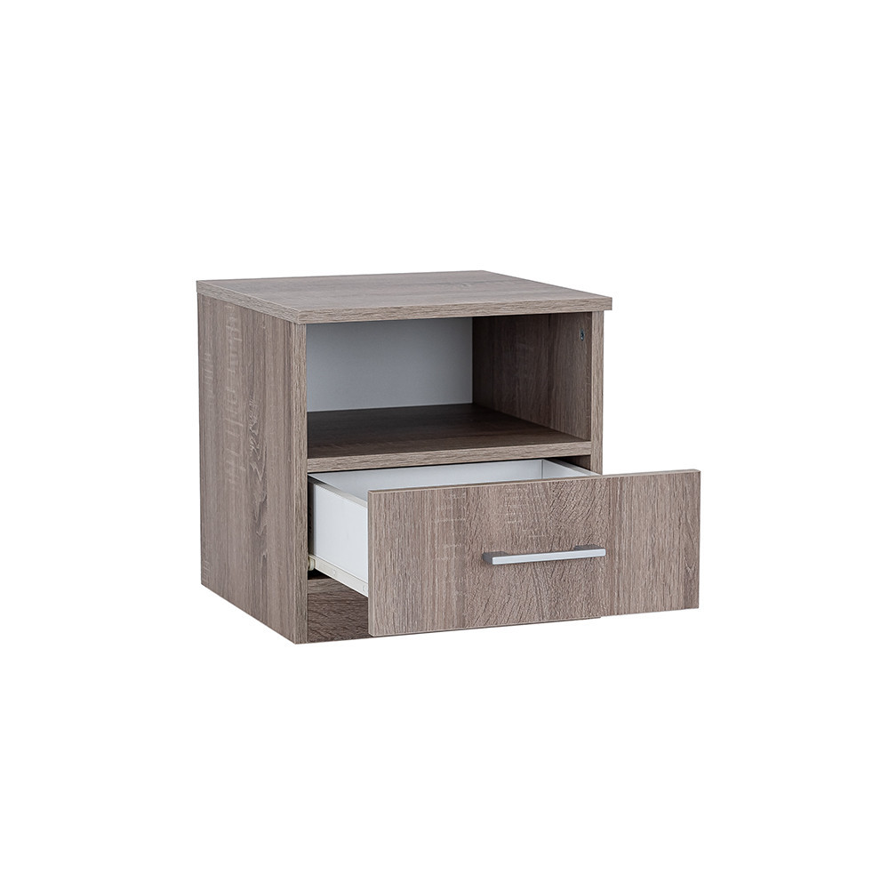 Dulapul de noptieră este fabricat din placă de mobilier de înaltă calitate.Datorită suprafețelor netede, noptiera este ușor de păstrat curată. Praful și alte murdării pot fi îndepărtate cu ușurință.