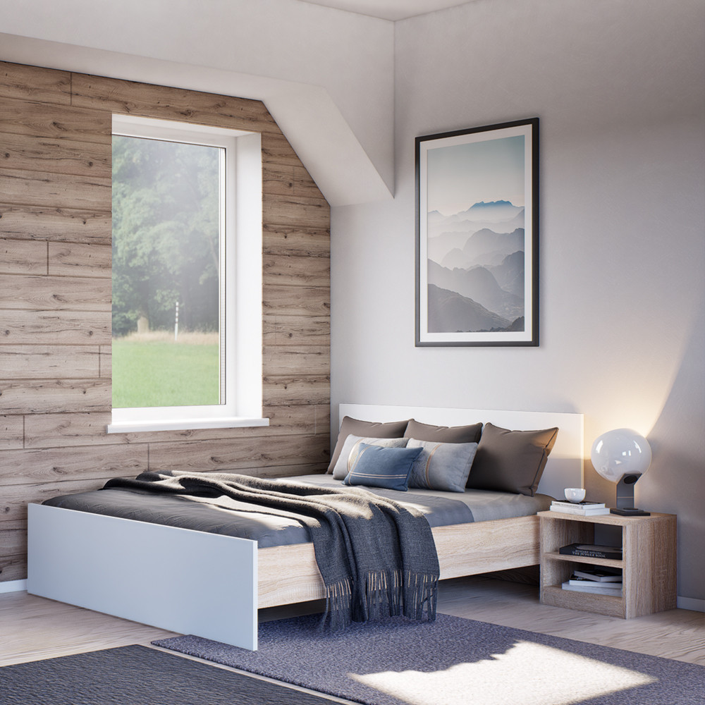 | Material | Placă de mobilier de înaltă calitate, stejar Sonoma, cu tăblie și capăt de pat albe. |