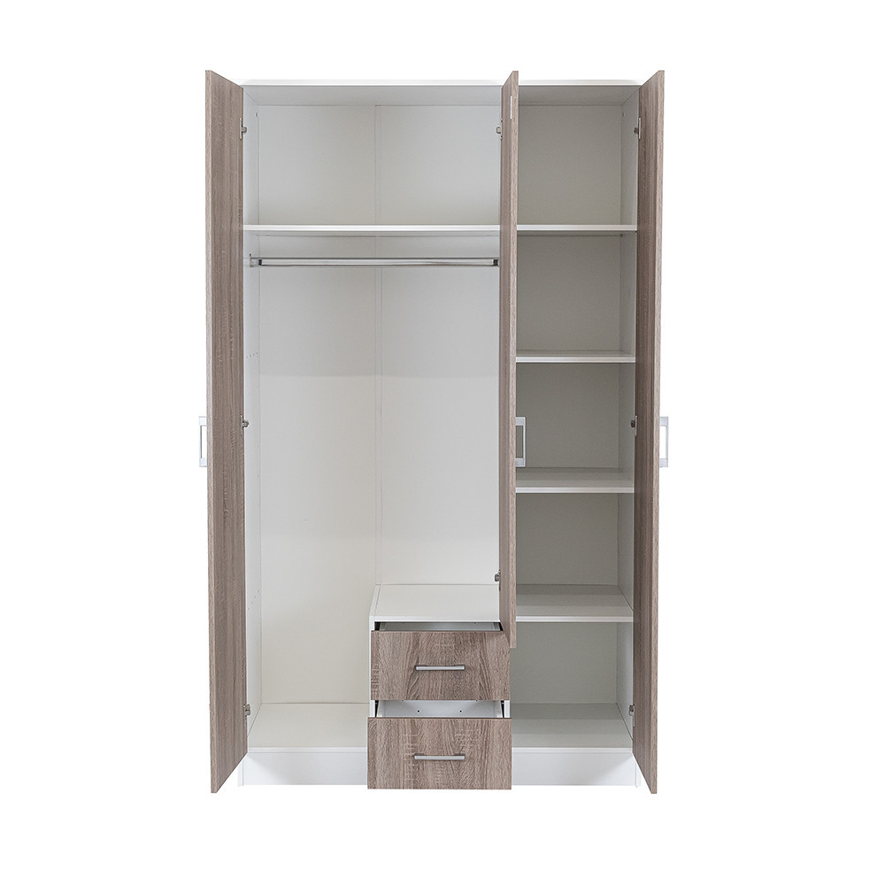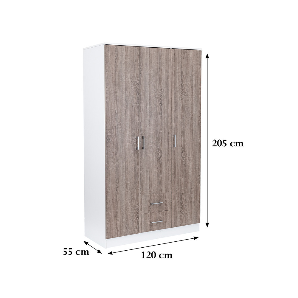 Elegantul fațadă din stejar York și efectul de lemn corp alb Combinația sa creează o armonie perfectă atât în living, cât și în dormitor. THE 205 cm înălțime, 120 cm lățime și 55 cm adâncime Un dulap este o alegere ideală pentru oricine dorește să își organizeze hainele și accesoriile.