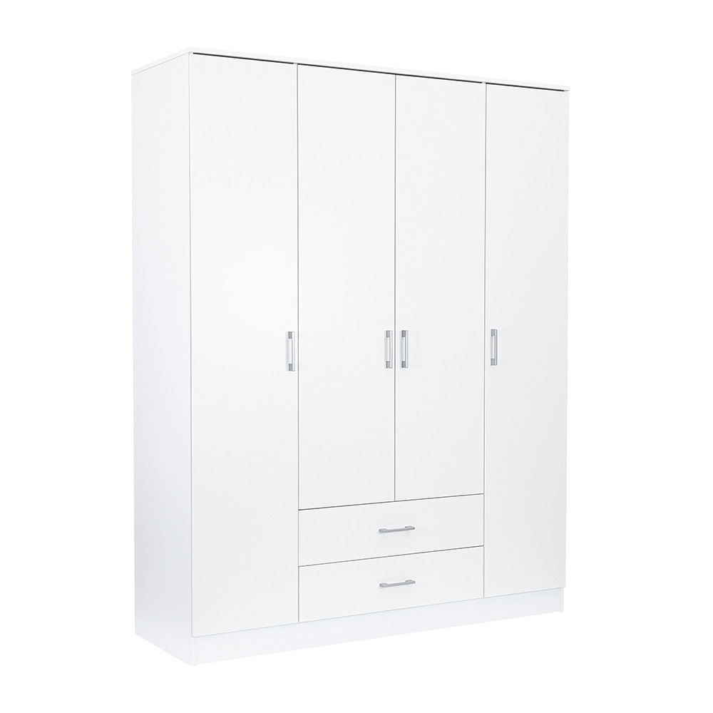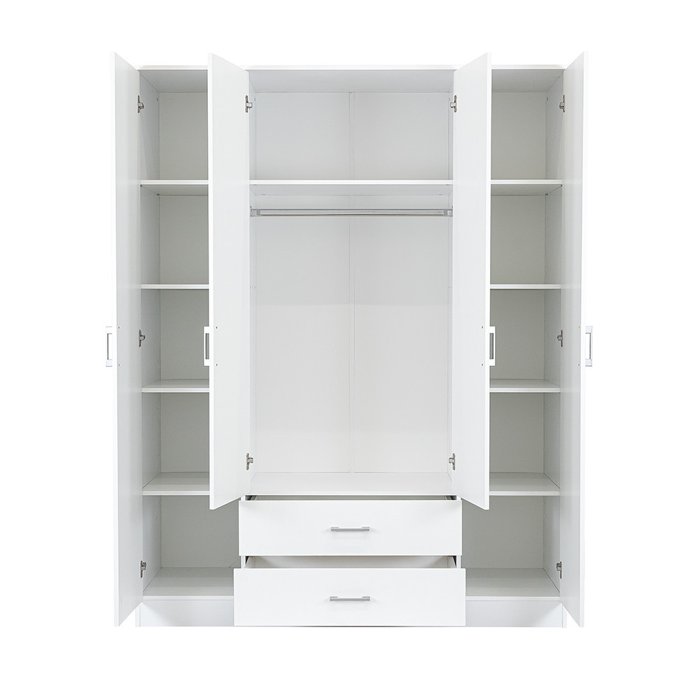 THE mânere din plastic cu efect cromat mat acestea conferă un aspect modern, în timp ce uși cu deschidere dublă și uși proiectate pentru sisteme de rafturi Întregul interior al dulapului este ușor vizibil, astfel încât toate hainele și obiectele sunt la îndemână. Cele 11 rafturi și două sertare pe roți Oferă un spațiu amplu de depozitare, fie că este vorba de lenjerie de pat, haine extrasezon sau lenjerie intimă.