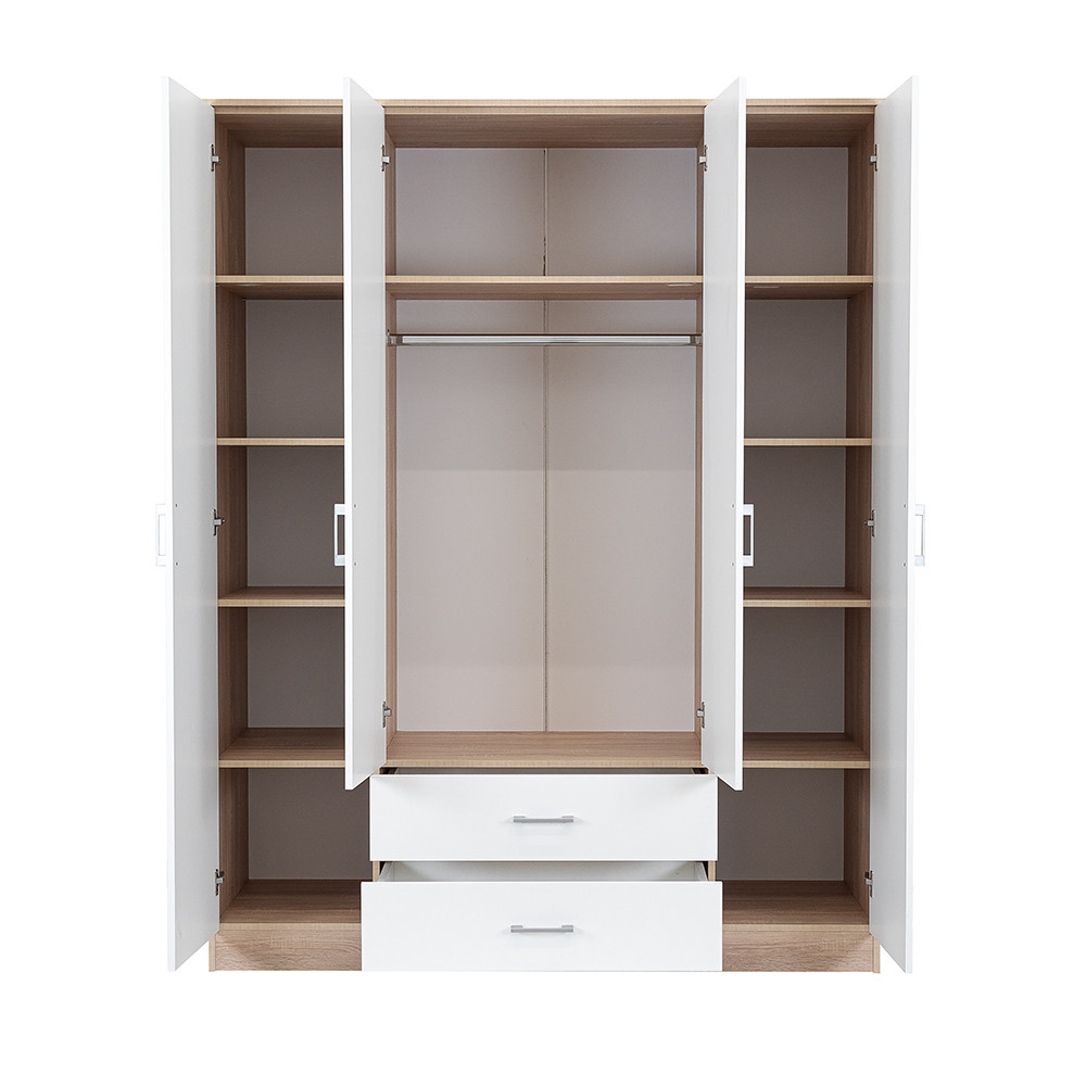 Elegantul față albă și corpul din stejar Sonoma cu efect de lemn Combinația sa creează o armonie perfectă atât în living, cât și în dormitor. THE 205 cm înălțime, 160 cm lățime și 55 cm adâncime Un dulap este o alegere ideală pentru oricine dorește să își organizeze hainele și accesoriile.