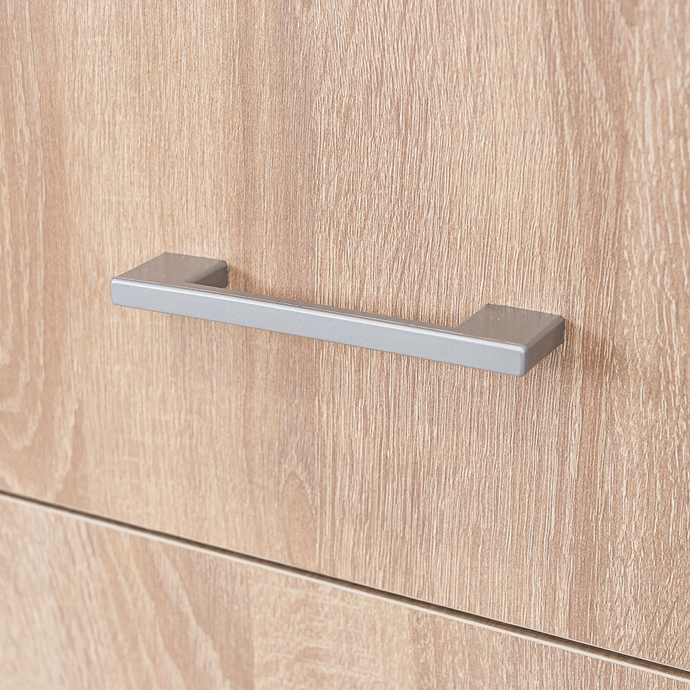 Mânerele din plastic cu efect cromat mat îi conferă un aspect modern, în timp ce ușile cu deschidere dublă oferă o vizibilitate ușoară asupra întregului interior al dulapului, făcând toate hainele și obiectele ușor accesibile. Cele cinci rafturi și cele două sertare pe roți oferă un spațiu amplu de depozitare, fie că este vorba de lenjerie de pat, haine extrasezon sau lenjerie intimă.