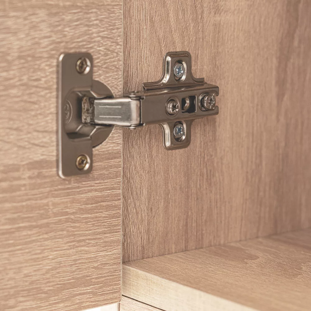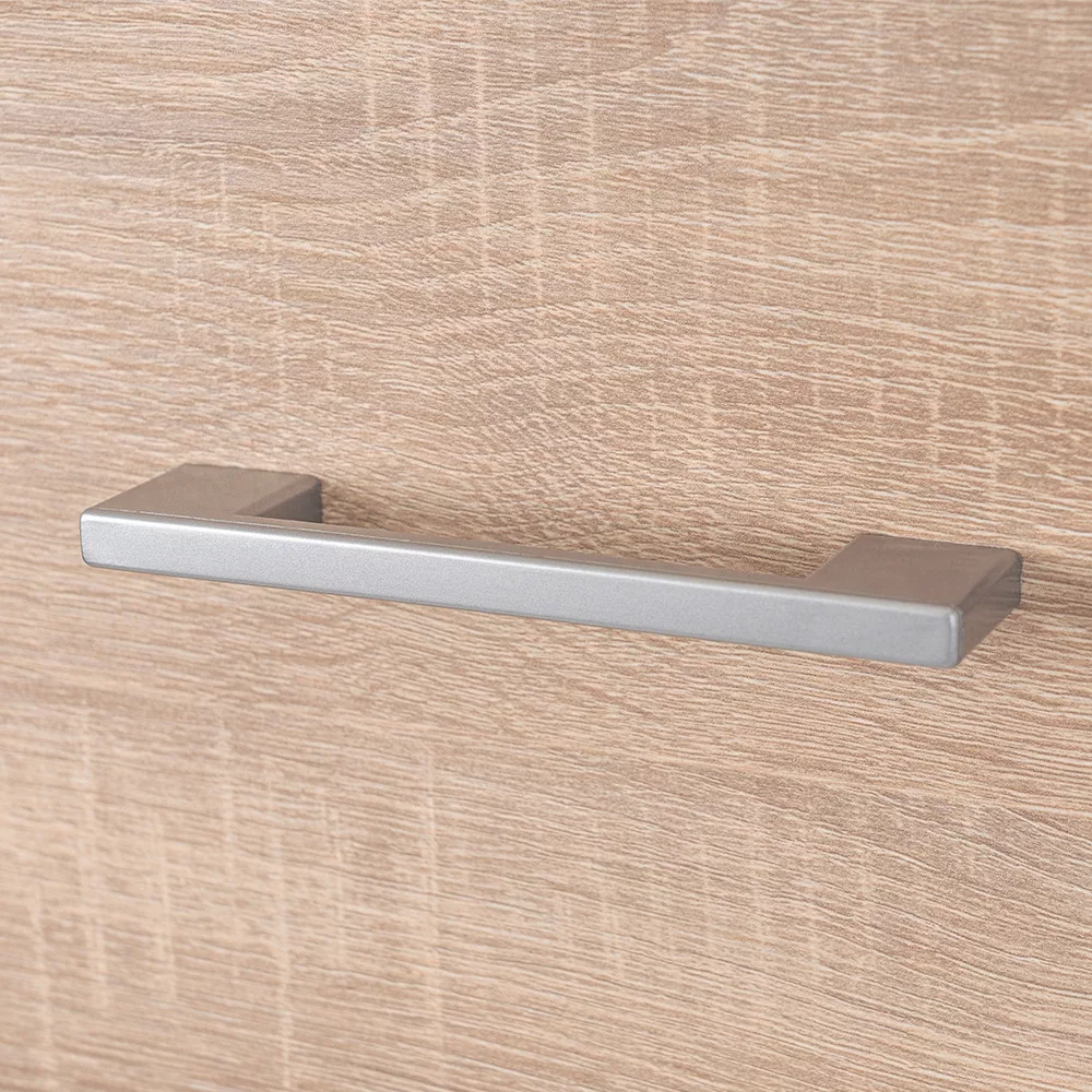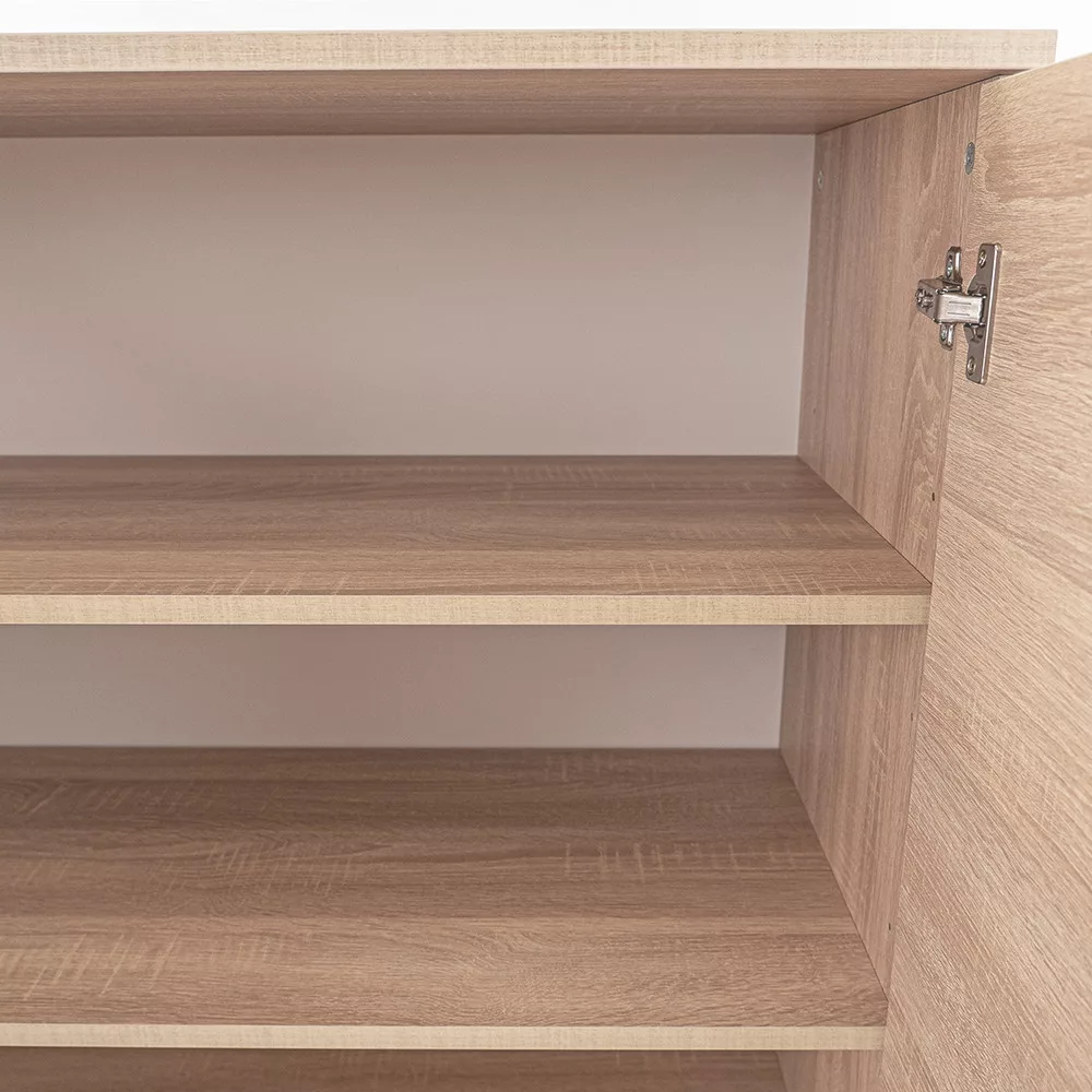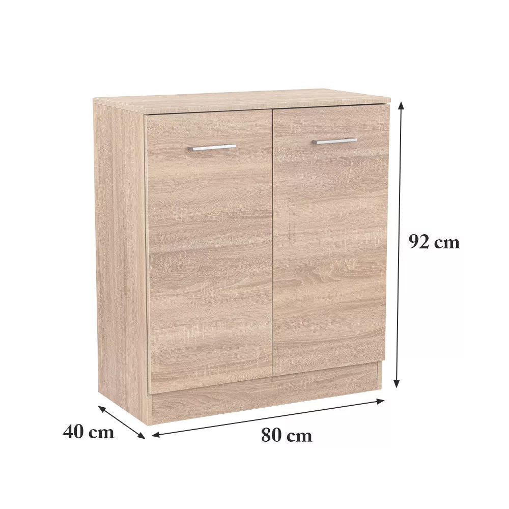 Comoda Miami , cu fațadă și corp din stejar sonoma, conferă claritate și eleganță spațiului, în timp ce materialul de calitate al plăcilor de mobilier garantează durabilitate și rezistență. Dimensiunile sale - 40 cm adâncime, 80 cm lățime, 92 cm înălțime - sunt ideale pentru orice cameră. În spatele ușilor cu două canate care se deschid ale comodei se află 3 rafturi , perfecte pentru depozitarea hainelor, cărților sau chiar a echipamentelor de birou. Designul modern este completat de mânere din plastic cu efect cromat mat , care fac aspectul și mai curat.