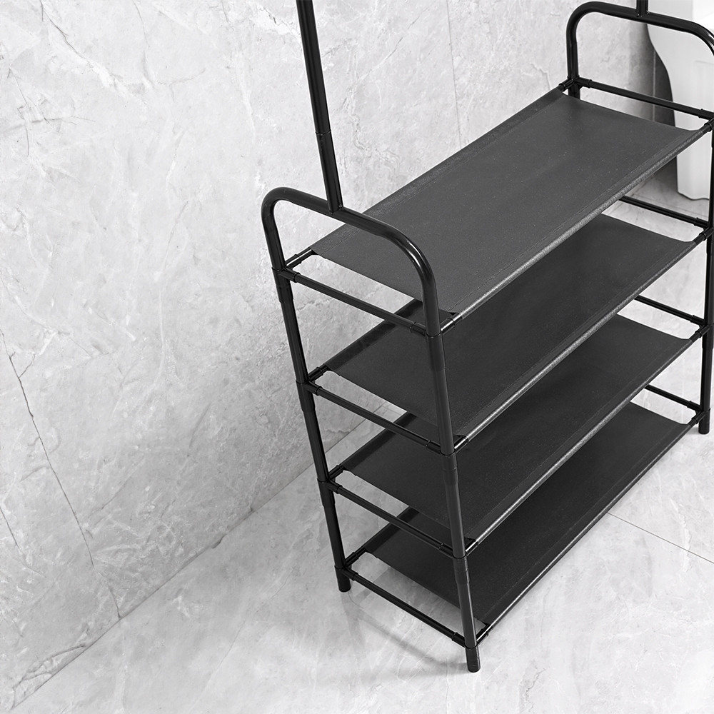 Acest suport de haine este fabricat dintr-o structură metalică durabilă, care asigură stabilitate și durabilitate. Rafturile sunt fabricate din plastic, care este ușor, dar totuși rezistent. Datorită culorii sale negre curate, emană eleganță și se poate integra cu ușurință în orice stil de casă.