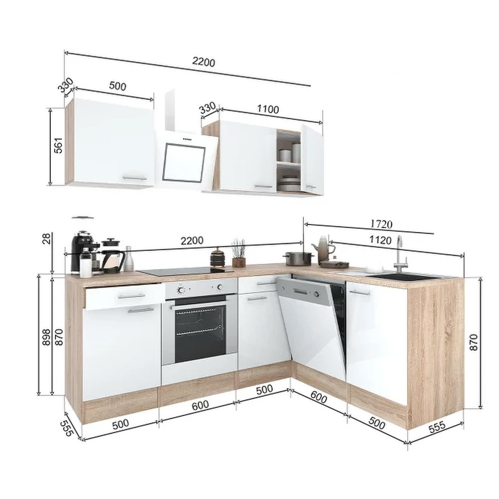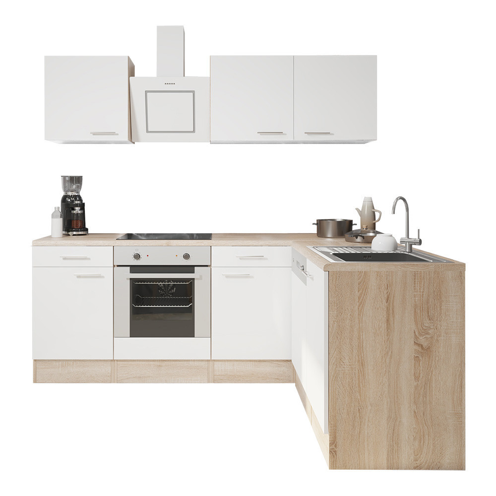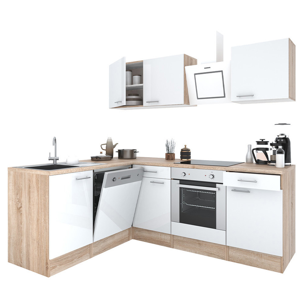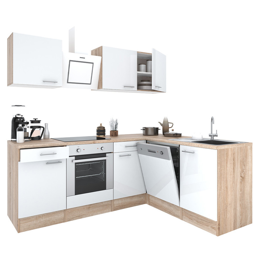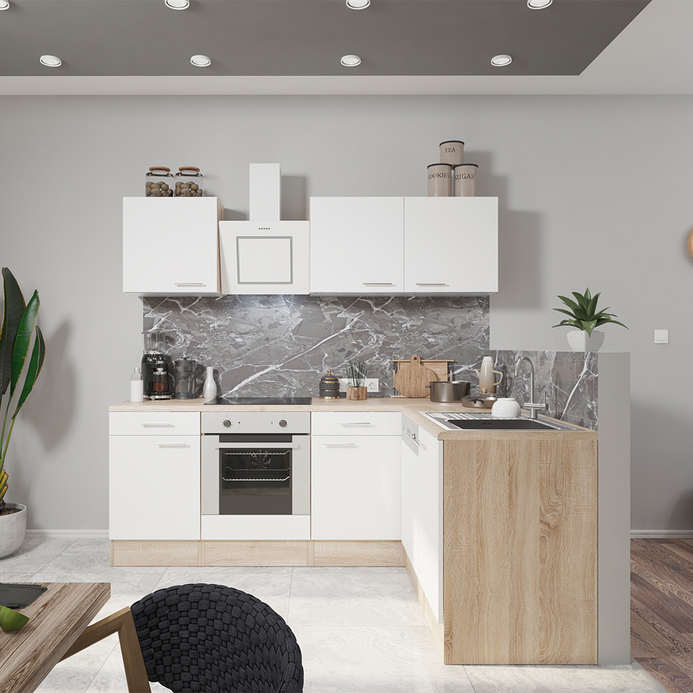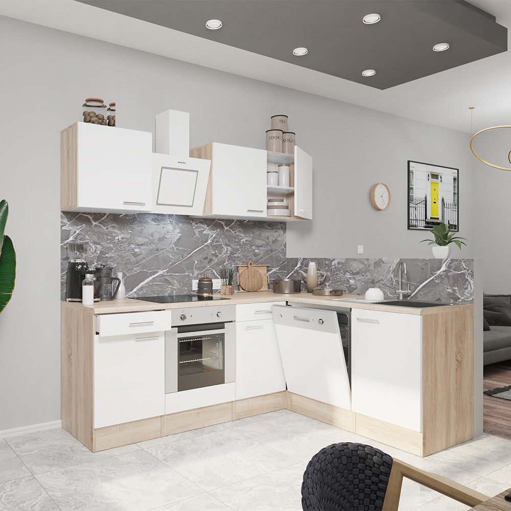 Unitate de bucătărie de colț Yorki 220 cu corp din stejar Sonoma și față alb satinat. Creatorul bucătăriei perfecte!