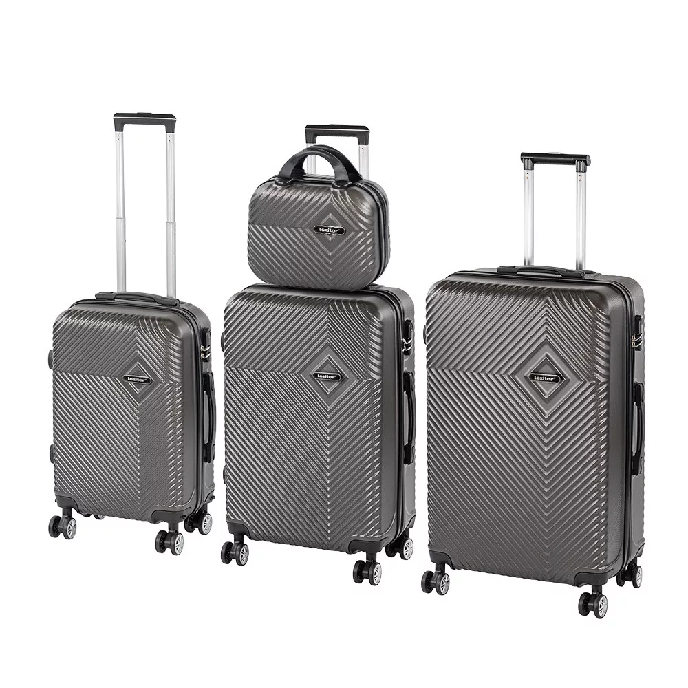 Conținut și dimensiuni: Valiza îngustă: 23 × 30 × 14 cm | 11 litri | 0,77 kg Valiza cabină: 55 × 40 × 20 cm | 38 litri | 2,6 kg Valiza medie: 68 × 45 × 25 cm | 60 litri | 2,65 kg Valiza mare: 76 × 50 × 29 cm | 100 litri | 3,3 kg - Material: plastic ABS ușor, rezistent la zgârieturi