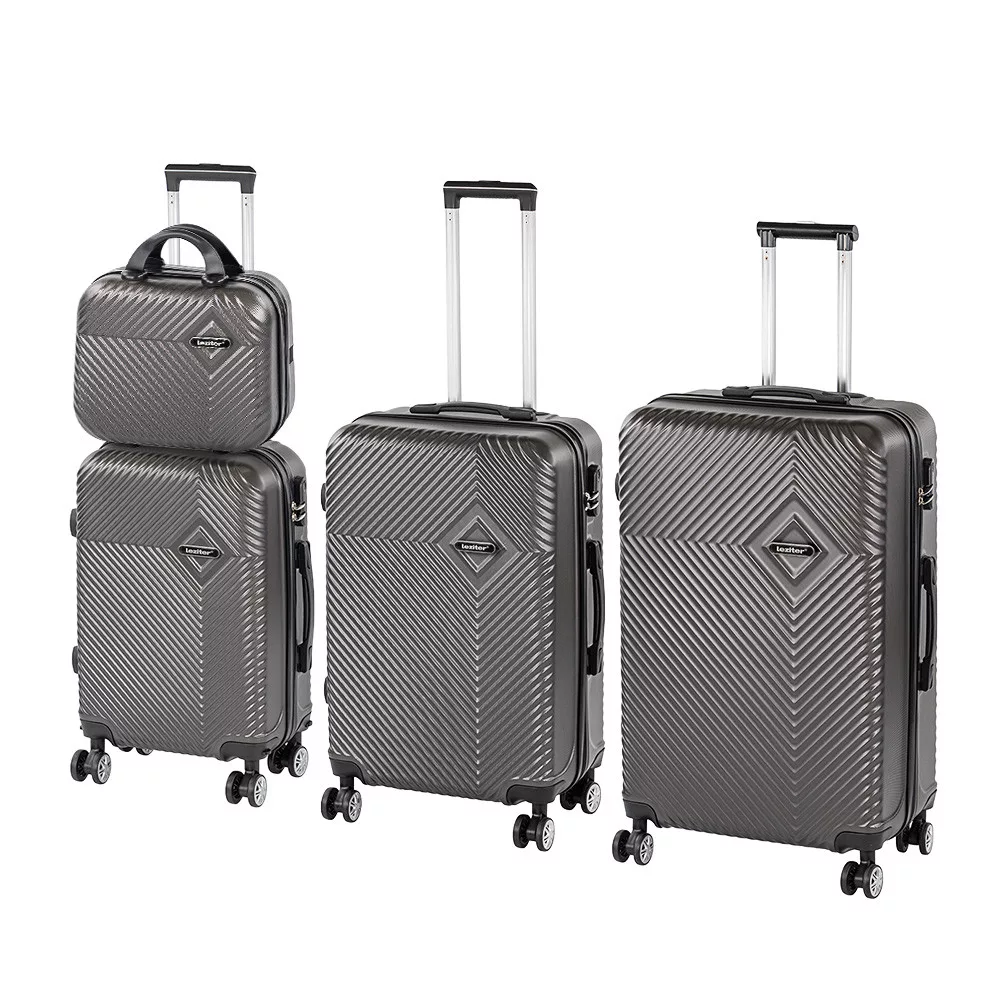 Conținut și dimensiuni: Valiza manuală: 28 × 36 × 16 cm | 11 litri | 0,77 kg Valiza cabină: 55 × 40 × 20 cm | 38 litri | 2,6 kg Valiza medie: 68 × 45 × 25 cm | 60 litri | 2,65 kg Valiza mare: 76 × 50 × 29 cm | 100 litri | 3,3 kg - Material: plastic ABS ușor, rezistent la zgârieturi