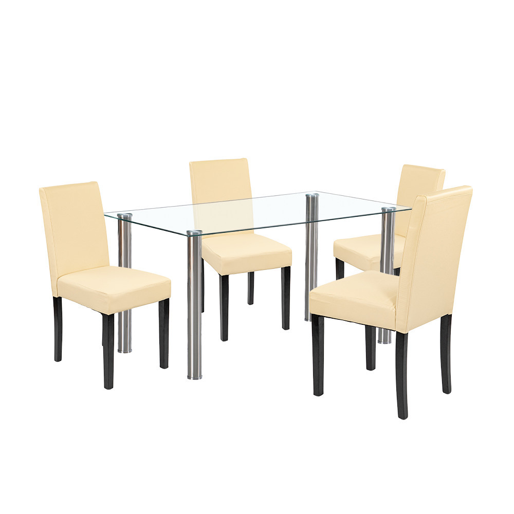 Setul include și patru scaune Leziter Kelly, tapițate cu piele ECO bej. Pe lângă aspectul elegant, aceste scaune sunt extrem de ușor de curățat. Șezutul din spumă cu grosimea de 4 cm oferă confort chiar și în timpul meselor mai lungi, iar picioarele stabile din lemn de pin, cu o capacitate de încărcare de 120 kg, garantează fiabilitate pe termen lung.