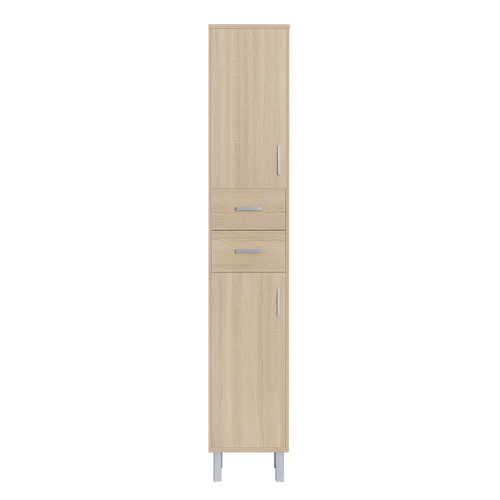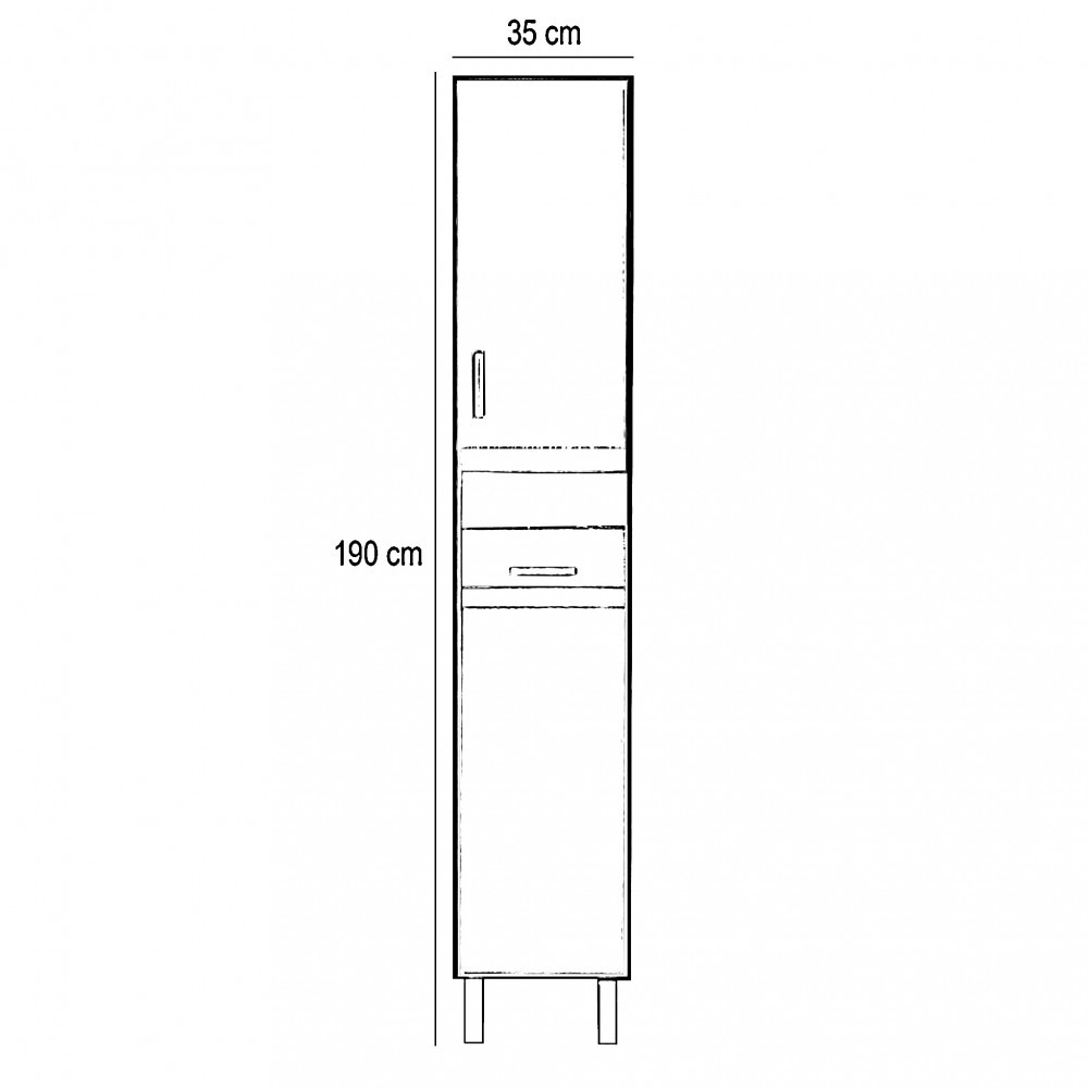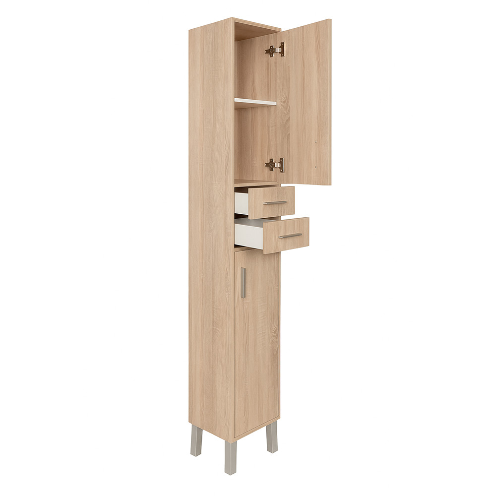 Mobilierul de baie ocupă puțin spațiu, dar are două dulapuri cu o singură ușă și două sertare spațioase unde pot încăpea confortabil articole de toaletă pentru baie. Datorită spațiului redus necesar, este potrivit și pentru mobilarea băilor mai mici, de exemplu în apartamentele cu panouri. Produsul este fabricat din plăci de mobilier de înaltă calitate și este prevăzut cu margini asortate în culori . Mobilierul de baie este disponibil într-o versiune independentă .