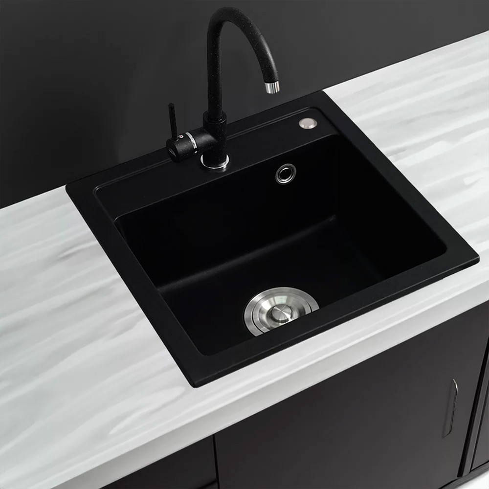 Inovația și calitatea se întâlnesc în chiuveta pătrată din granit cu o singură cuvă Nia. Finisajul din granit negru întruchipează eleganța și stilul modern, în timp ce materialele de calitate premium asigură durabilitatea.