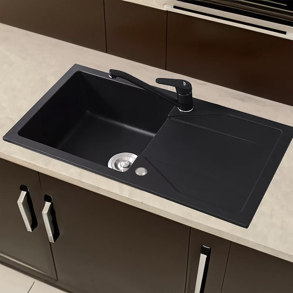 O chiuvetă din granit negru oferă întotdeauna bucătăriei tale un aspect modern și atemporal. Gama largă de culori îi permite să se potrivească cu echipamentele și mediul din bucătărie, fie că este vorba de un stil modern sau clasic.