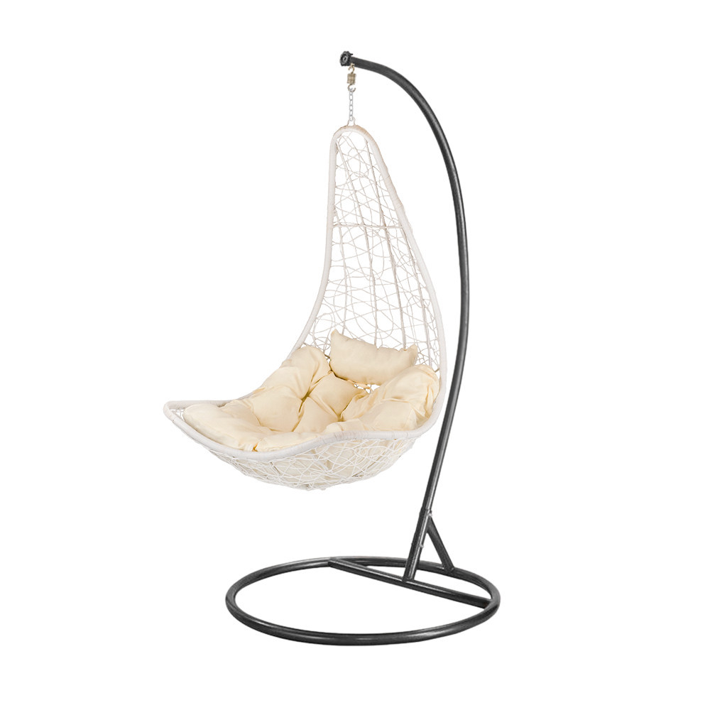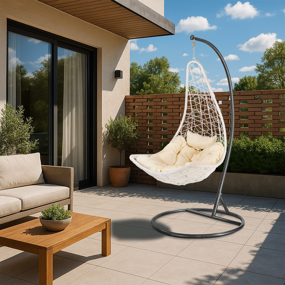 Coșul este fabricat din poliratan împletit dens, care, pe lângă beneficiile sale estetice, este și rezistent la intemperii. Materialul de rattan de culoare albă este rezistent la condițiile meteorologice extreme, astfel încât hamacul își va păstra frumusețea în timp.