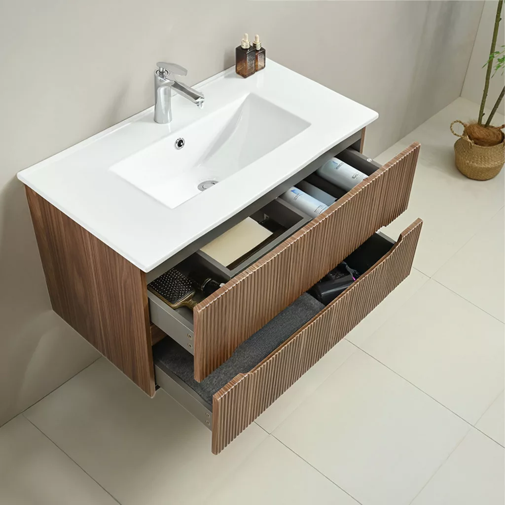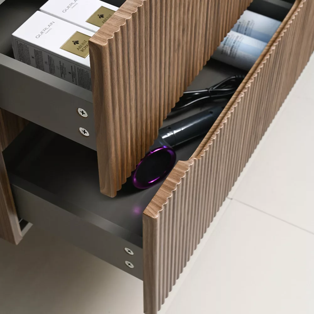 Mobila are două sertare spațioase, complet extensibile , care, cu organizatoare interne, vă ajută să depozitați accesoriile de baie în mod clar. Designul unic, fără mâner, cu o adâncitură frezată orizontal, face deschiderea convenabilă și estetică, menținând în același timp aspectul uniform și modern al mobilei.