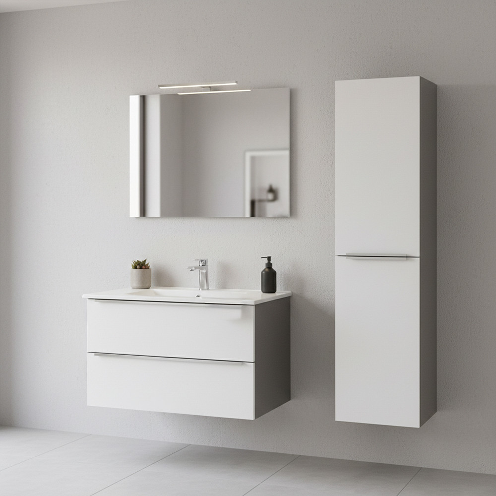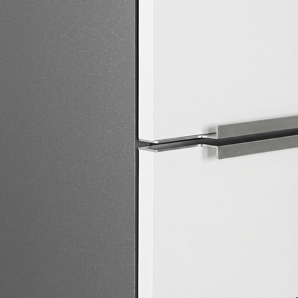 Dulapul lateral suspendat Vario Trim 35cu design suspendat oferă băii un aspect modern și curat, facilitând în același timp curățenia zilnică: podeaua este lăsată liberă dedesubt, făcând ca spațiul să pară mai spațios și mai ordonat. Ușa poate fi montată atât în stânga, cât și în dreapta, ceea ce este deosebit de avantajos în băile mici, unde fiecare centimetru contează.Dulapul este fabricat din panouri de mobilier durabile care rezistă la umiditatea zilnică din baie.Suprafețele sunt ușor de curățat. Profilul mânerului metalic Trim accentuează și mai mult caracterul elegant și modern al mobilierului; acesta oferă confort în utilizare și se îmbină armonios cu aspectul sofisticat al suprafețelor alb-antracit.