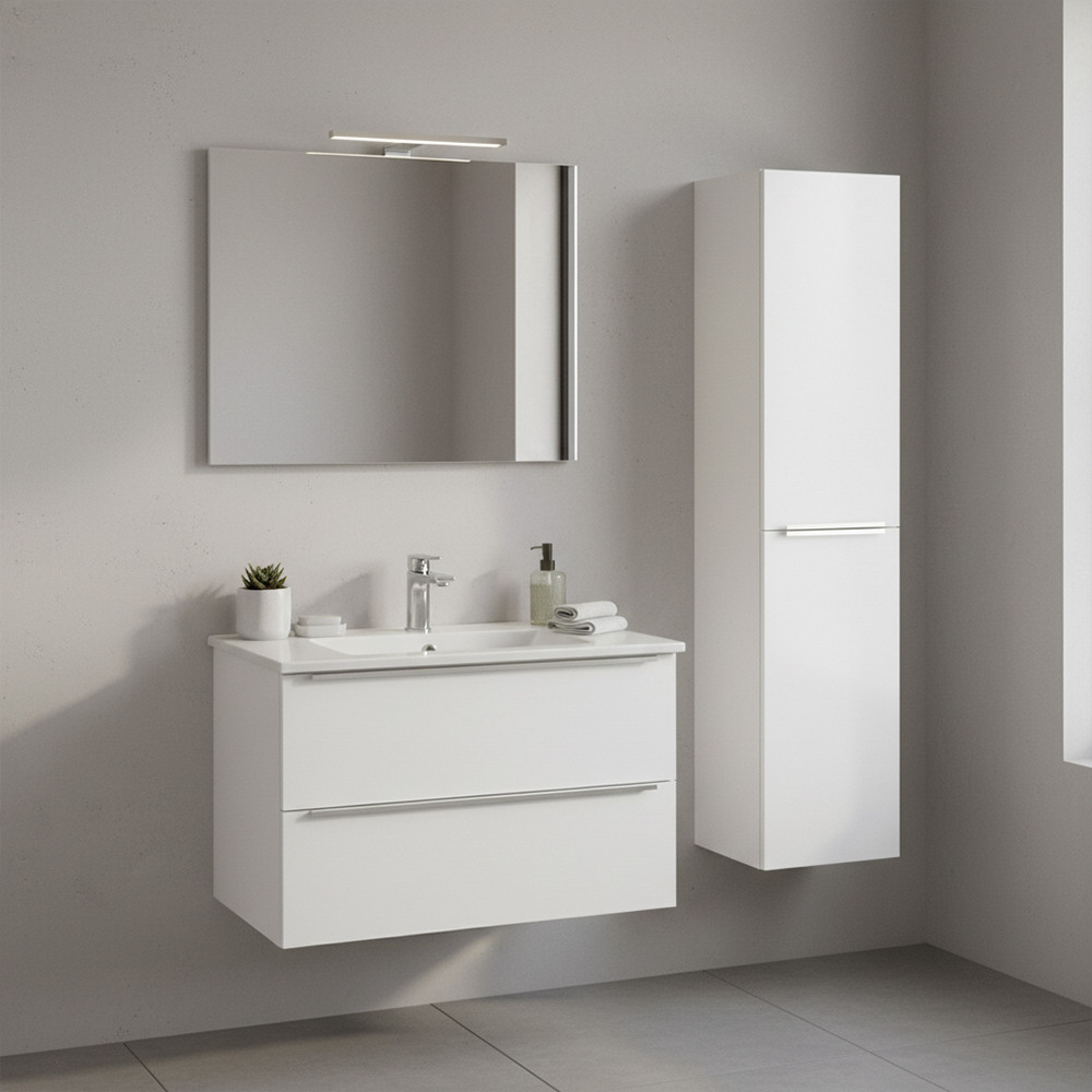 Dulapul lateral suspendat Vario Trim 35cu design suspendat oferă băii un aspect modern și curat, facilitând în același timp curățenia zilnică: podeaua este lăsată liberă dedesubt, făcând ca spațiul să pară mai spațios și mai ordonat. Ușa poate fi montată atât în stânga, cât și în dreapta, ceea ce este deosebit de avantajos în băile mici, unde fiecare centimetru contează.Dulapul este fabricat din panouri de mobilier durabile care rezistă la umiditatea zilnică din baie.Suprafețele sunt ușor de curățat. Profilul mânerului metalic Trim accentuează și mai mult caracterul elegant și modern al mobilierului; acesta oferă confort în utilizare și se îmbină armonios cu aspectul sofisticat al suprafețelor alb pe alb.