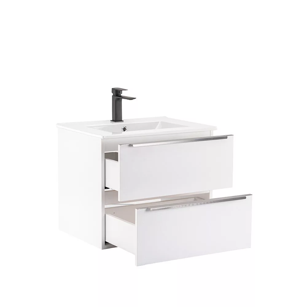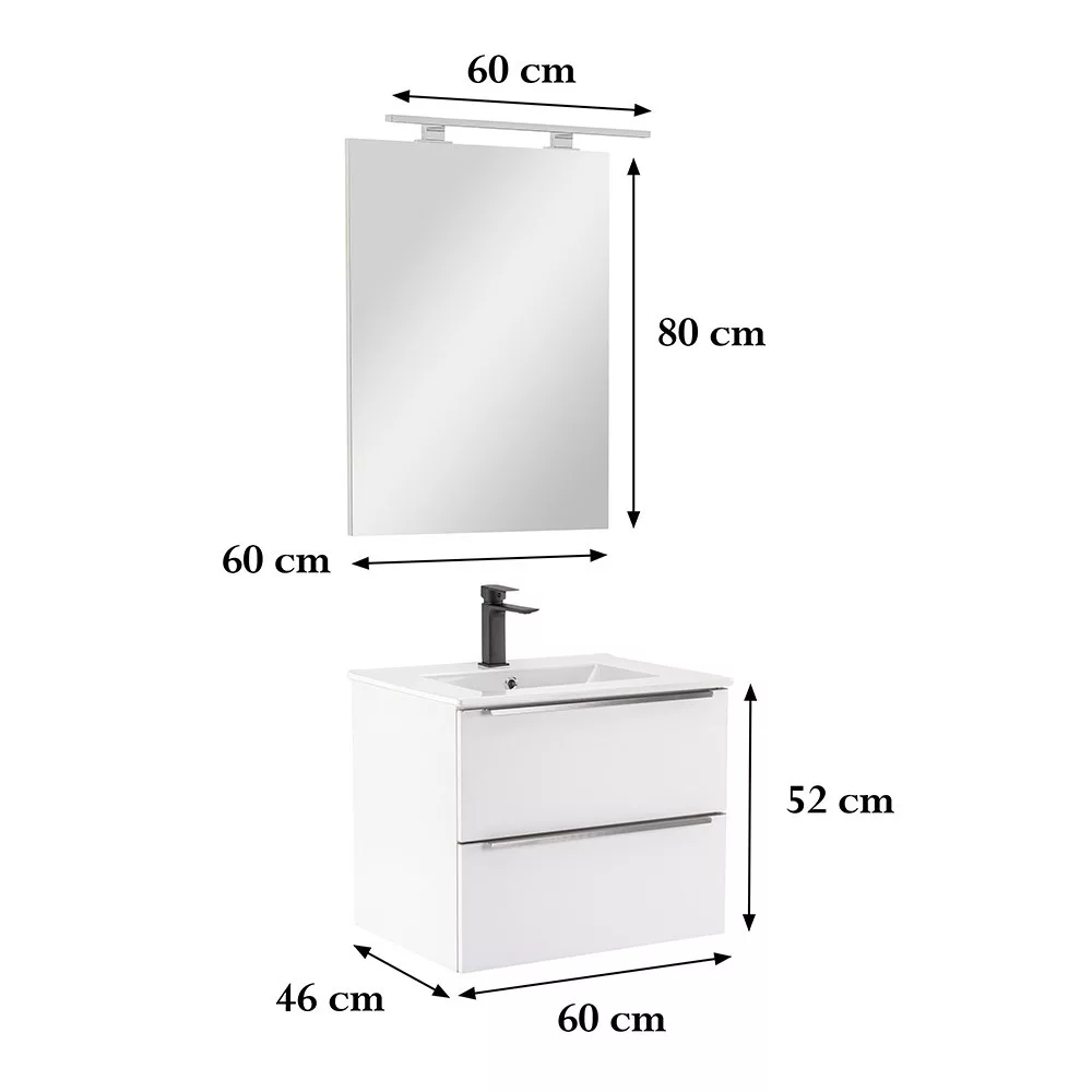 Mobilierul complet de baie Vario Trim 60 este o alegere elegantă și practică pentru o baie modernă. Dimensiunile sale compacte sunt ideale pentru băi mici și medii, iar profilul metalic al mânerului conferă spațiului un efect de patină, în timp ce designul alb pe alb îi conferă un aspect elegant. Sertarul cu închidere silențioasă și designul suspendat oferă confort și curățare ușoară, în timp ce materialele de calitate asigură o durată lungă de viață.