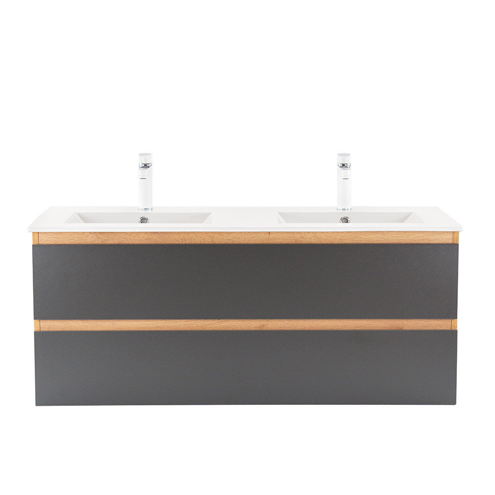 Mobilierul complet de baie Vario Forte 120 este o alegere elegantă și practică pentru o baie modernă. Dimensiunile sale compacte sunt ideale pentru băi mici și medii, închiderea la margine la 45 de grade oferă un efect modern, iar designul din stejar-antracit conferă spațiului un aspect elegant. Sertarul cu închidere silențioasă și designul suspendat oferă confort și curățare ușoară, în timp ce materialele de calitate asigură o durată lungă de viață.