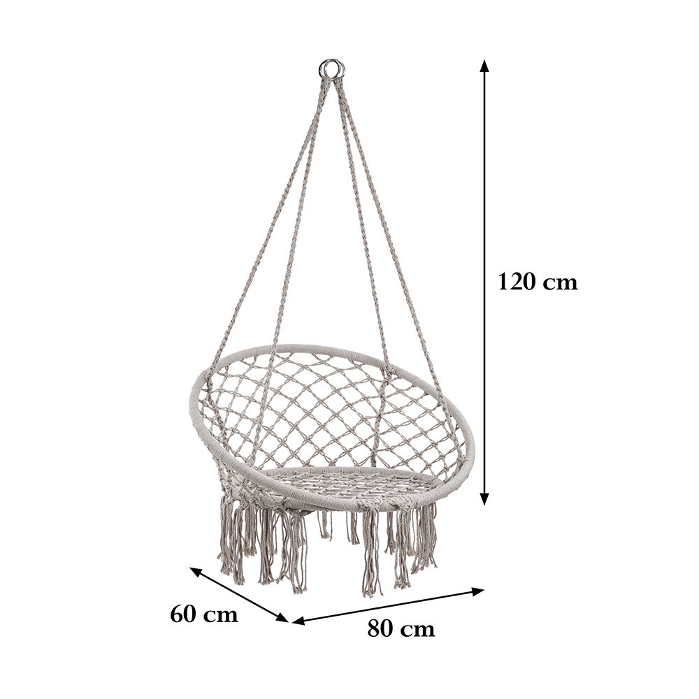 Fotoliul hamac gri Cardenas gri este perfect pentru dimensiunile casei sau terasei dvs. Dispunând de un cordon de bumbac cu rame de fier, dimensiunile sale sunt de 80x60x120 cm, oferind proporțiile ideale pentru o relaxare confortabilă și sofisticată. Lățimea de 80 cm oferă un loc confortabil de ședere și poziționare a corpului, în timp ce adâncimea de 60 cm permite poziționarea confortabilă a corpului. Iar înălțimea de 120 cm oferă distanța potrivită față de podea pentru a vă așeza ușor în hamac. De asemenea, este important să rețineți că scaunul hamac Cardenas este extrem de durabil și stabil, cu o capacitate de încărcare de până la 180 kg. Astfel, vă puteți bucura de confort și liniște sufletească fără să vă faceți griji cu privire la fiabilitatea scaunului dvs. de hamac.