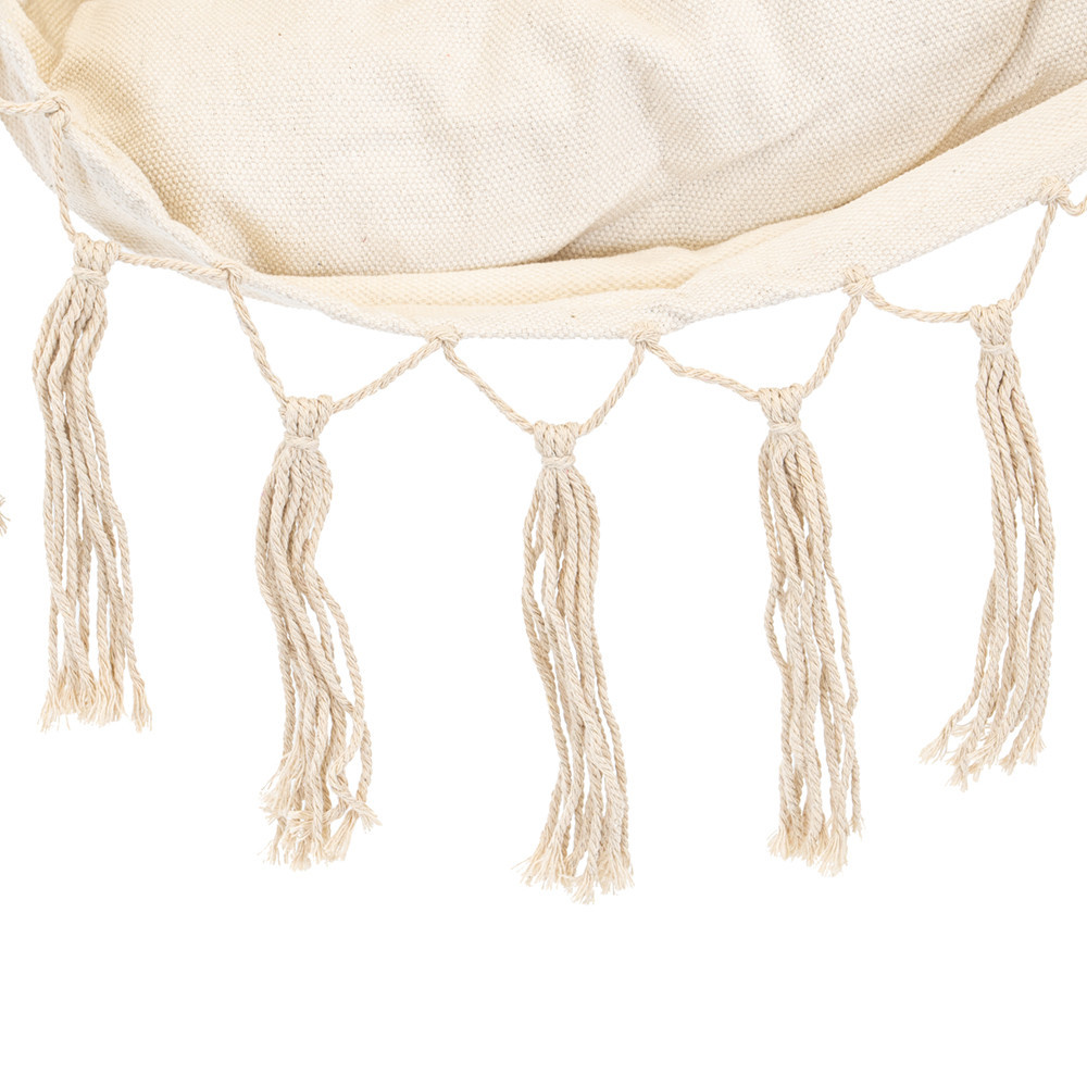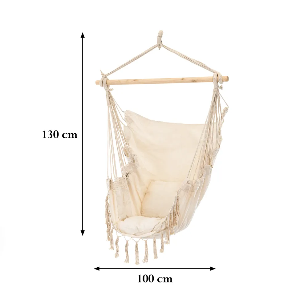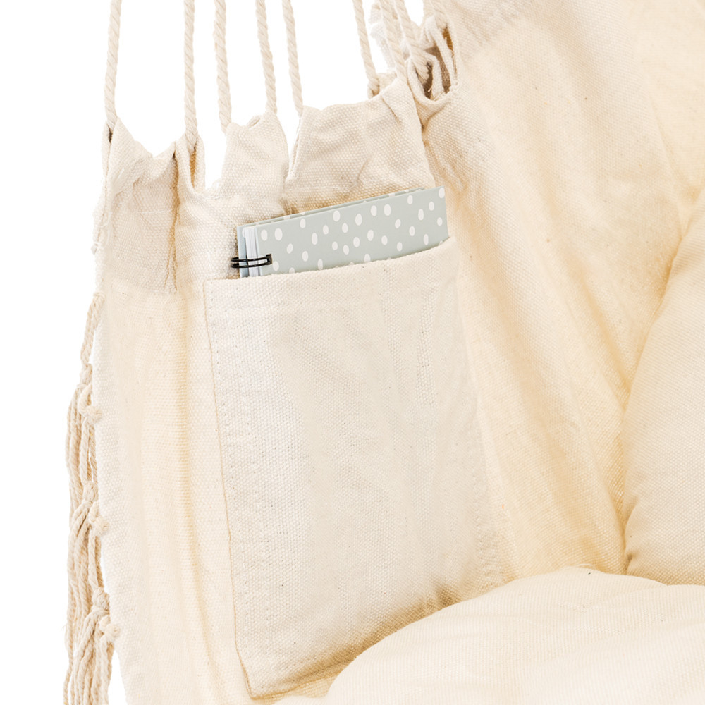 Scaunul hamac Puerto este o alegere excelentă dacă sunteți în căutarea relaxării la domiciliu sau a unui accesoriu elegant pentru exterior. Dispunând de perne din țesătură din bumbac și poliester de 330 gsm, umplutură de calitate și o geamandură decorativă, hamacul Puerto nu este doar plăcut din punct de vedere estetic, ci și extrem de confortabil.