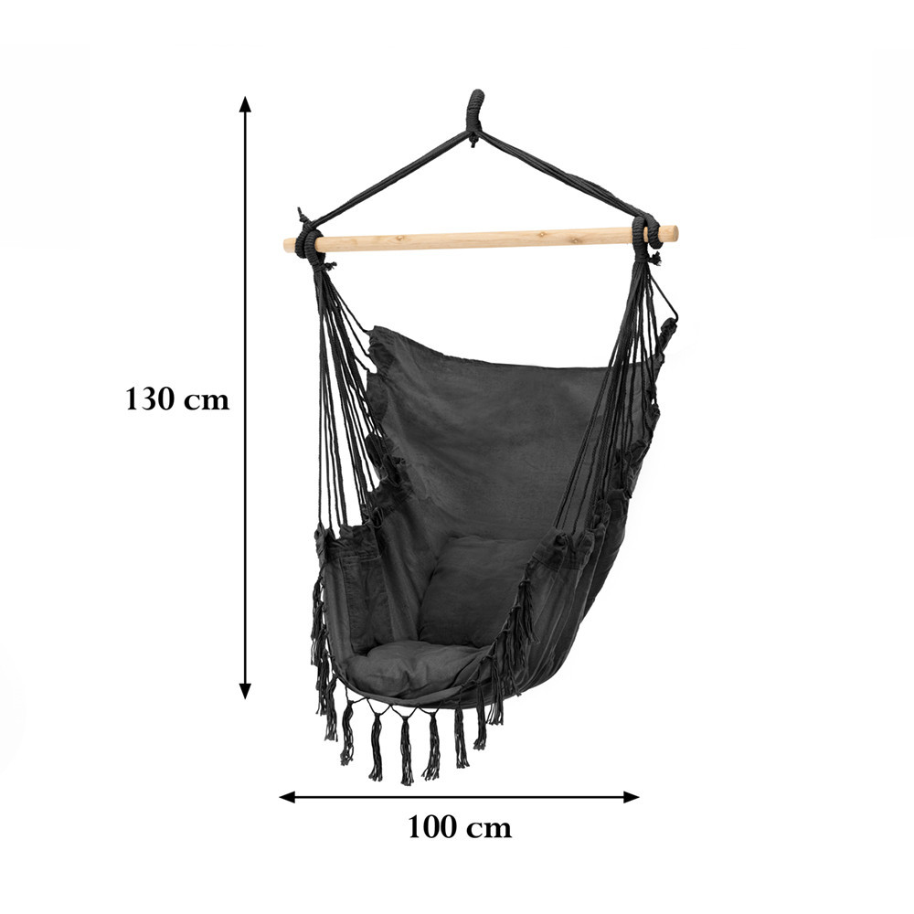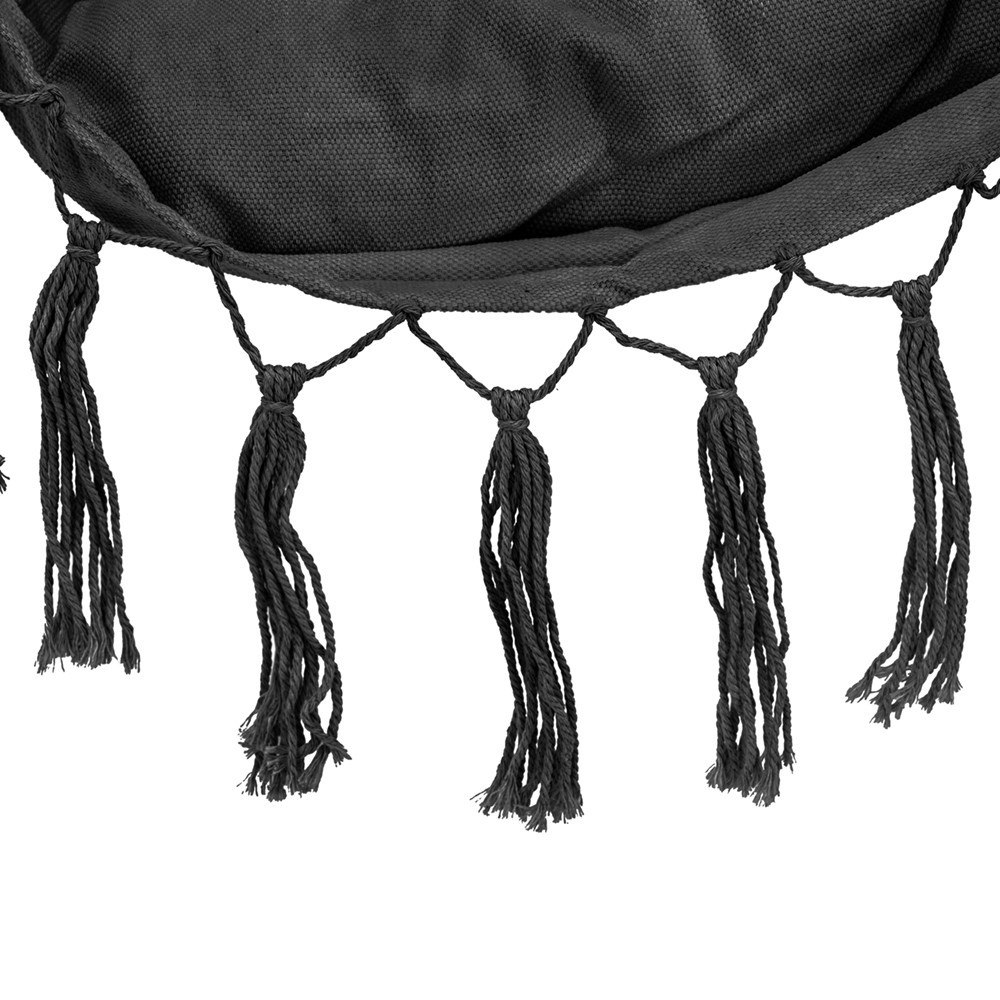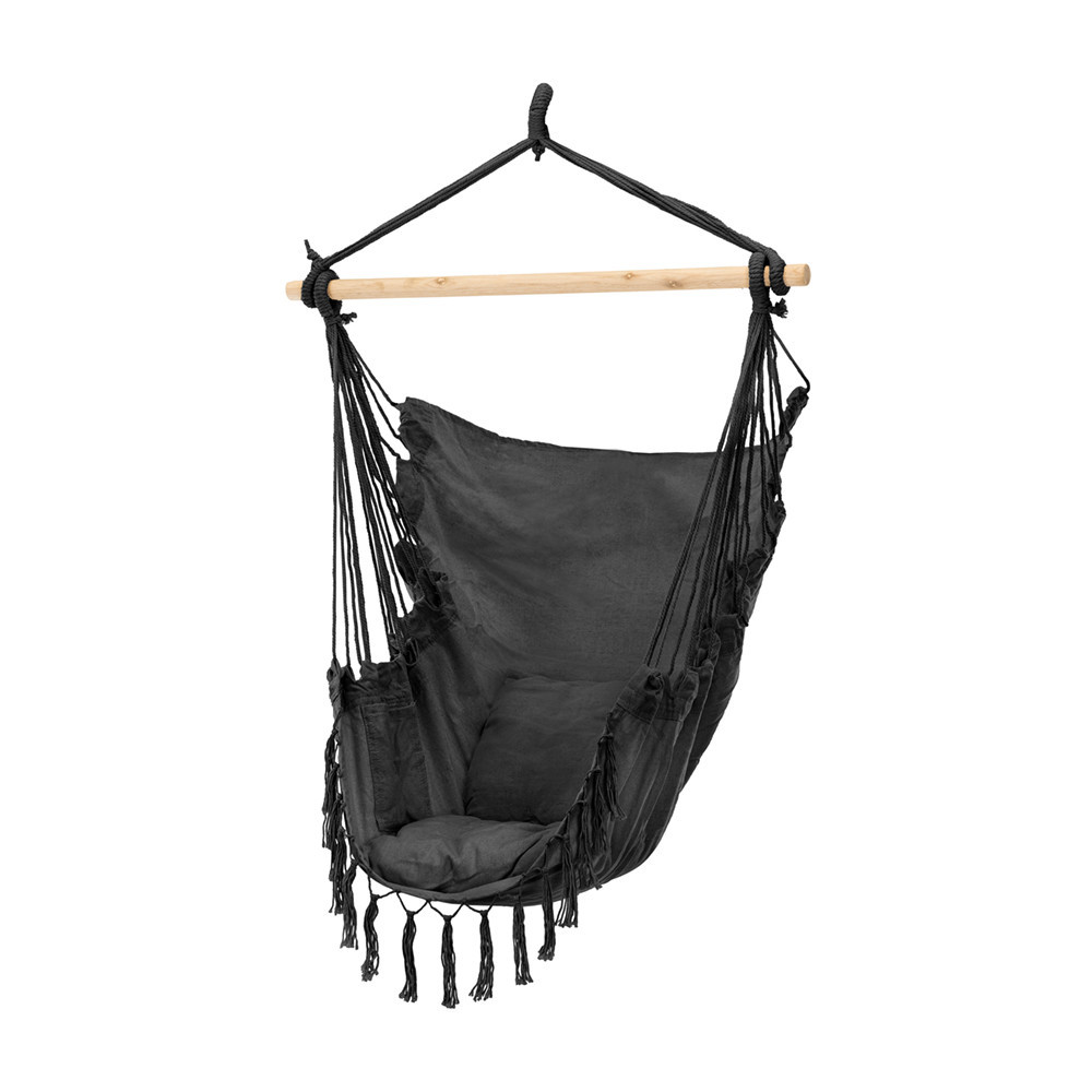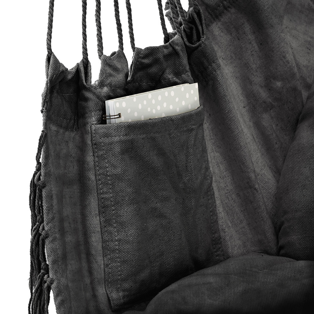 Scaunul hamac Puerto este o alegere excelentă dacă sunteți în căutarea relaxării la domiciliu sau a unui accesoriu elegant pentru exterior. Dispunând de perne din țesătură de poliester și bumbac de 330 gsm, umplutură de calitate și o geamandură decorativă, hamacul Puerto nu este doar plăcut din punct de vedere estetic, ci și extrem de confortabil.