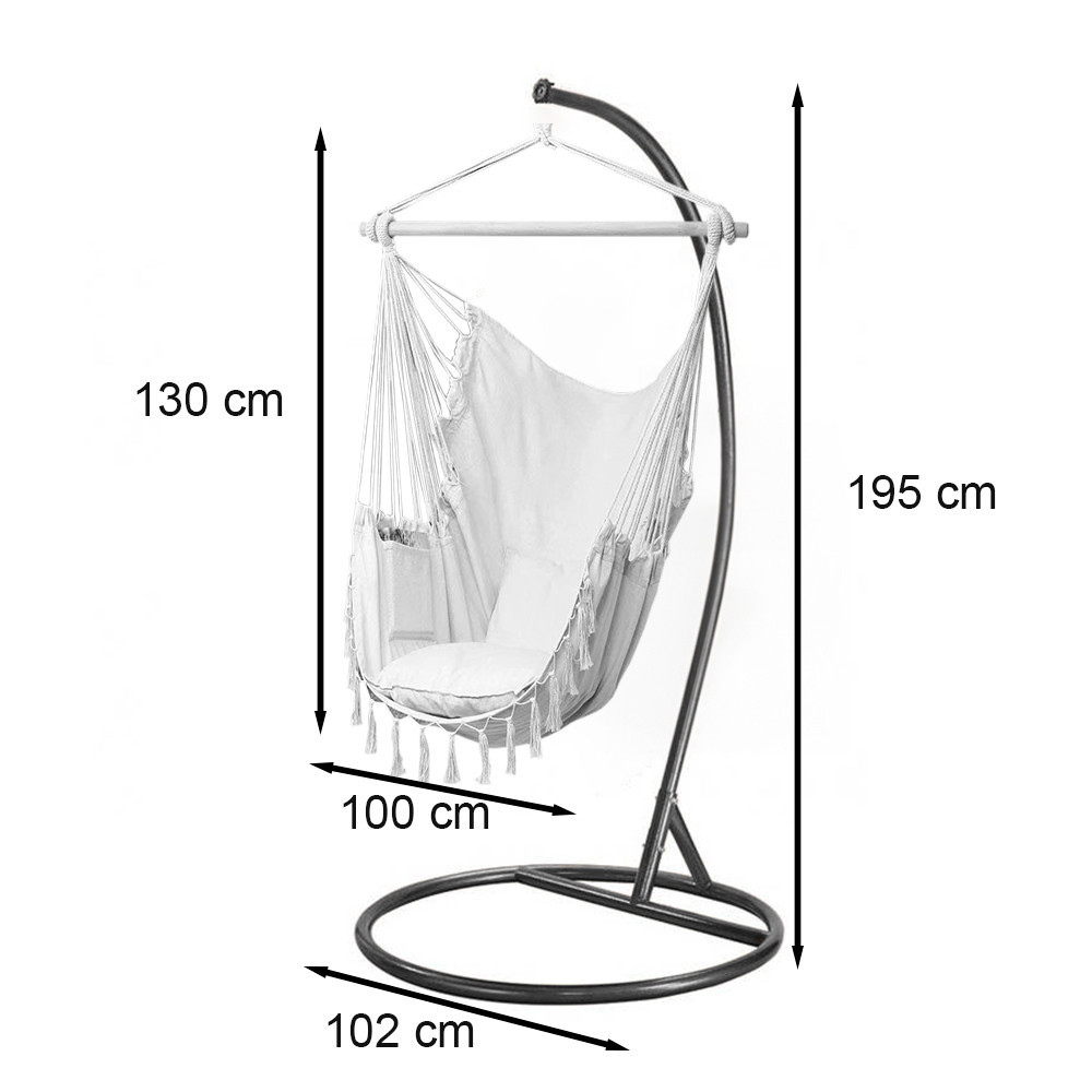 A fekete színű függőfotel állvány masszív, időjárásálló acélból készült, így garantálja a hosszú távú használatot és tartósságot. A 195 cm magas, 102 cm átmérőjű alap stabil tartást biztosít még akkor is, ha teljes súllyal hintázol a székben.