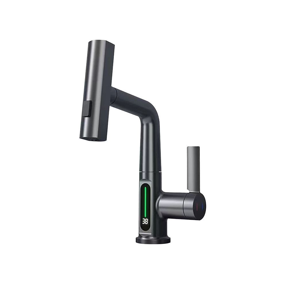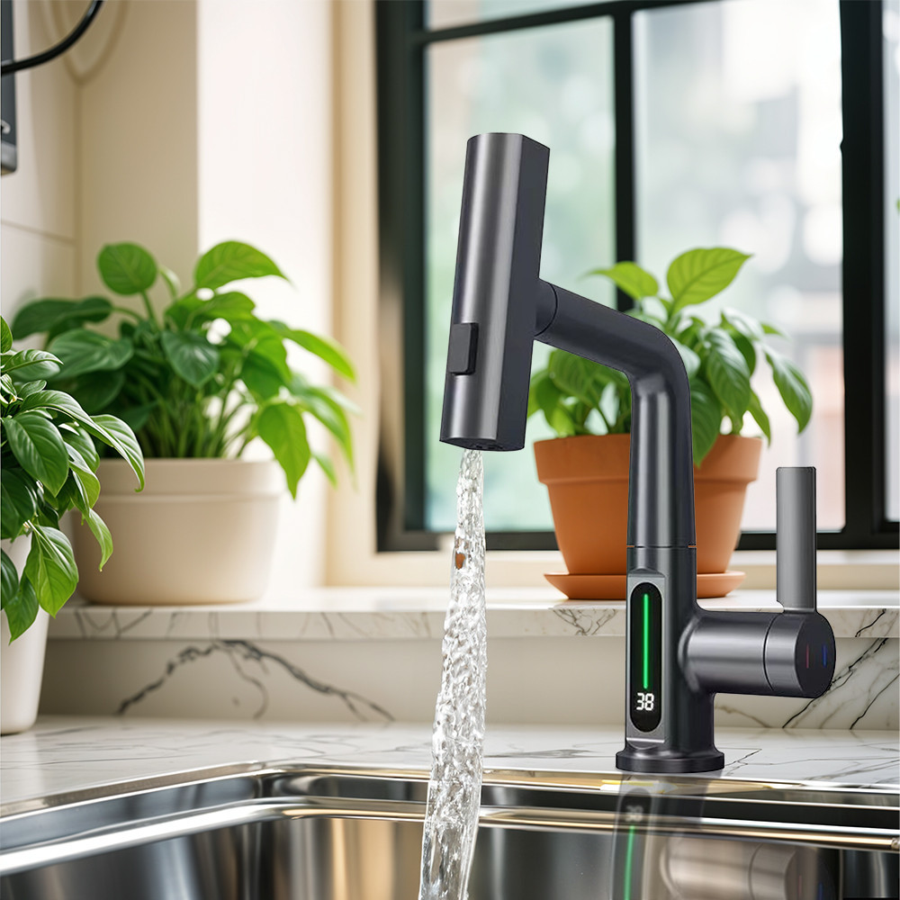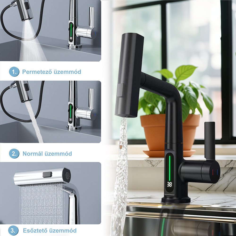 Există un afișaj digital al temperaturii pe robinet? Da, robinetul are încorporat un afișaj digital al temperaturii care arată cu precizie temperatura apei în culori diferite: albastru (0-30°C), verde (30-40°C) și roșu (40-49°C).