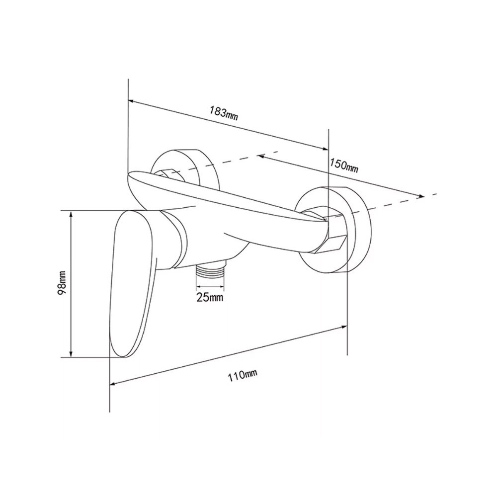 - Dimensiuni: lățime totală 183 mm, distanță de perete 150 mm, înălțime 98 mm, lungime gura de scurgere 110 mm, diametru de ieșire 25 mm