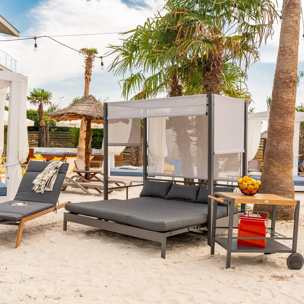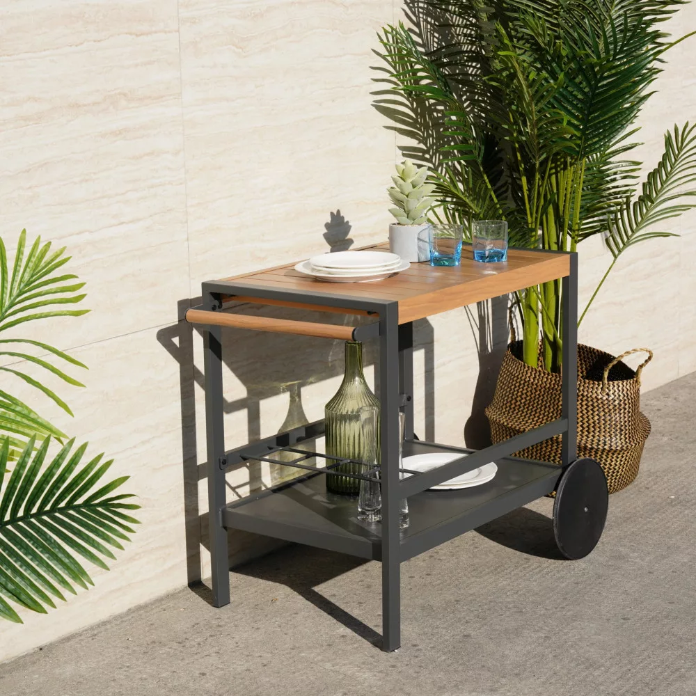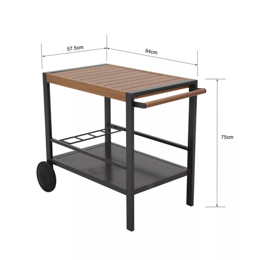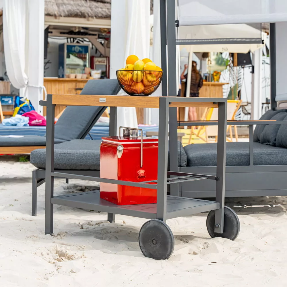 Calitatea manoperei mobilierului se reflectă în durabilitatea sa. Căruciorul cu roți are un cadru din aluminiu acoperit cu pulbere cu rezistență sporită la coroziune, ceea ce îl face perfect pentru utilizarea în exterior. Partea superioară este realizată din plăci de aluminiu și este stabilă, astfel încât puteți așeza pe ea orice mâncare sau băutură. Transportul este ușor datorită roților mari și mânerului practic. Materialele utilizate înseamnă că mobilierul este durabil și vă va servi pentru o perioadă lungă de timp.