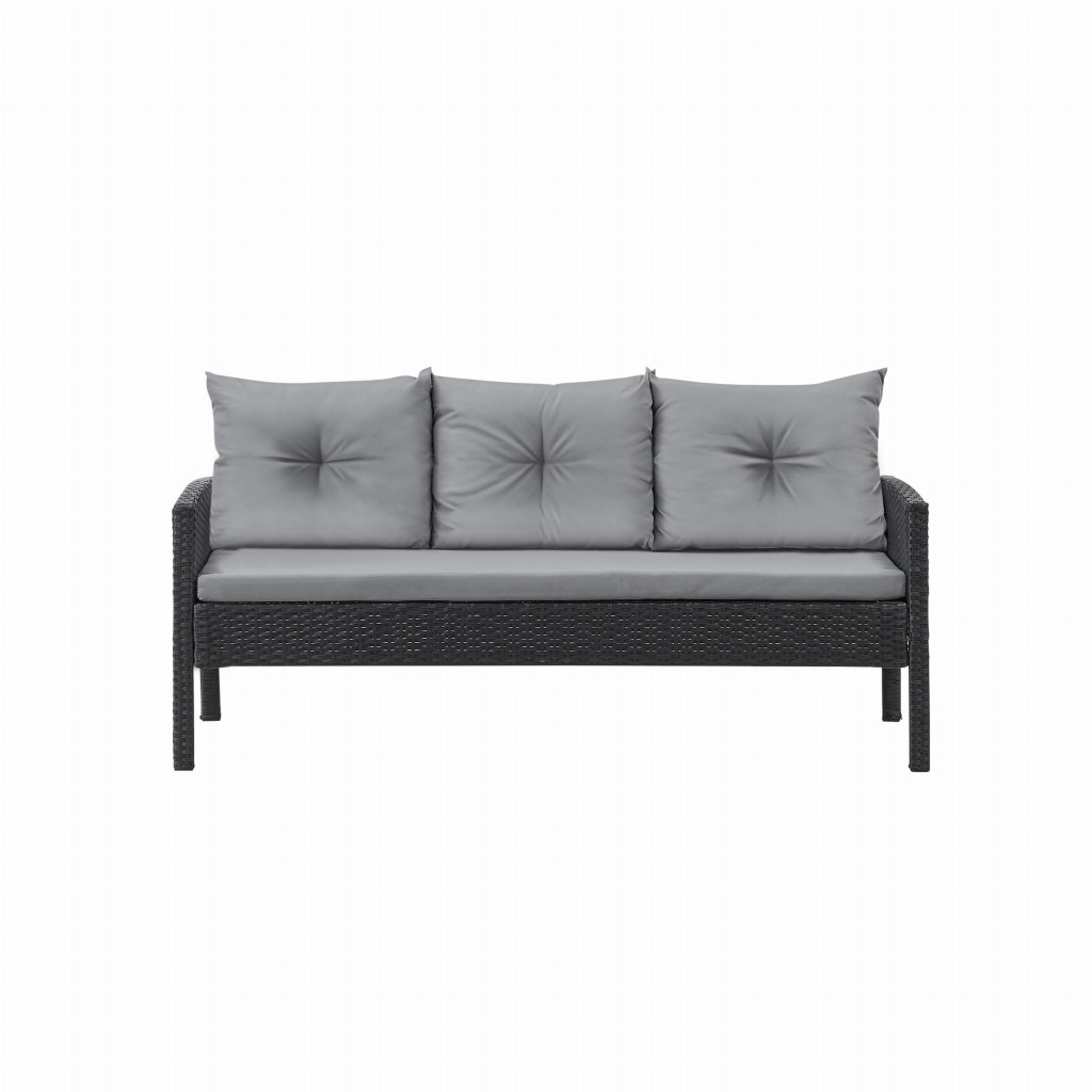 Mobilier de grădină confortabil conceput pentru a găzdui 7 persoane, oferind confort pentru mese și relaxare în aer liber. Setul include o canapea lată, cu 3 locuri, ca piesă centrală, precum și două scaune și două perne pentru a așeza confortabil oaspeții. Întregul creează un spațiu funcțional și confortabil pentru relaxare și împărțirea meselor.