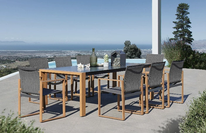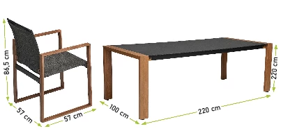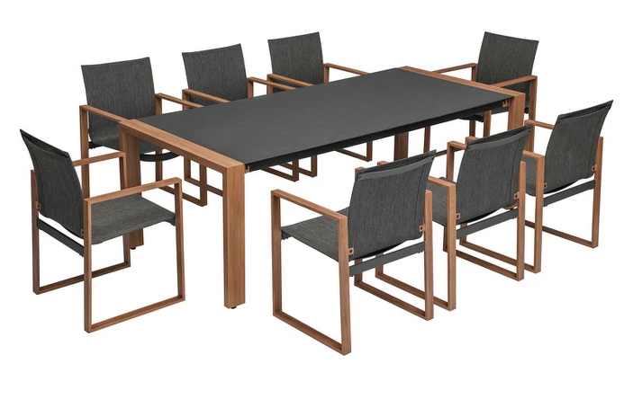 Setul este alcătuit din nouă piese de mobilier, și anume 8 scaune și o masă. Dimensiunile scaunului (LxAxÎ): 57x57,3x86,5 cm, capacitate maximă de încărcare 100 kg, dimensiunile mesei (LxAxÎ): 220x100x74,5 cm. Blatul mesei este fabricat din sticlă securizată, ceea ce garantează durabilitatea și rezistența acesteia. Designul unic al mobilei multiplică și specializează imitația furnirului cu model de lemn natural, care se regăsește pe cotierele și picioarele mobilei.